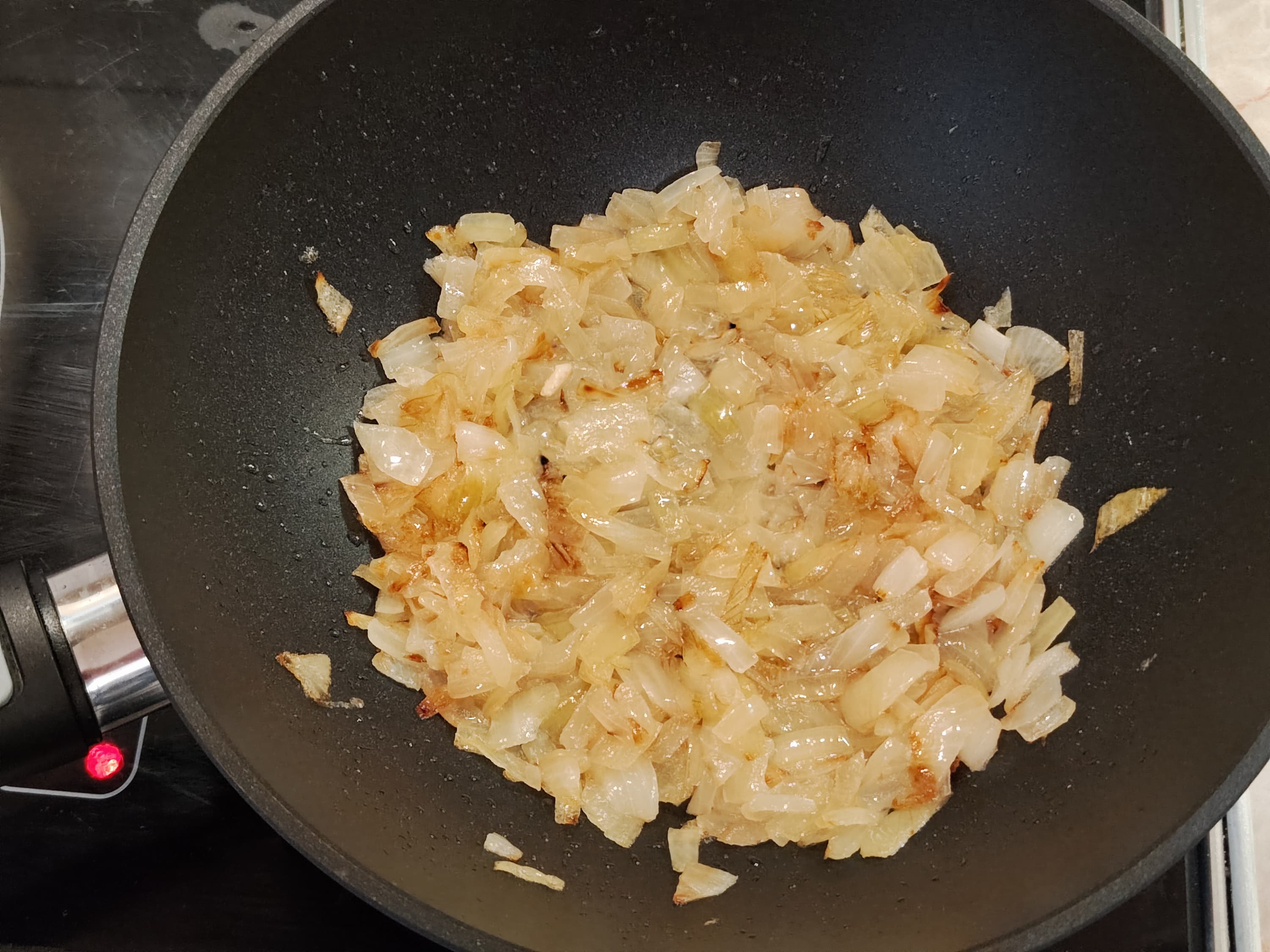 Полторы крупных луковицы обжарили в смеси растительного и сливочного масла. Жарить не спешили, цель была получить хорошо потушенный и немного карамелизованный лук.