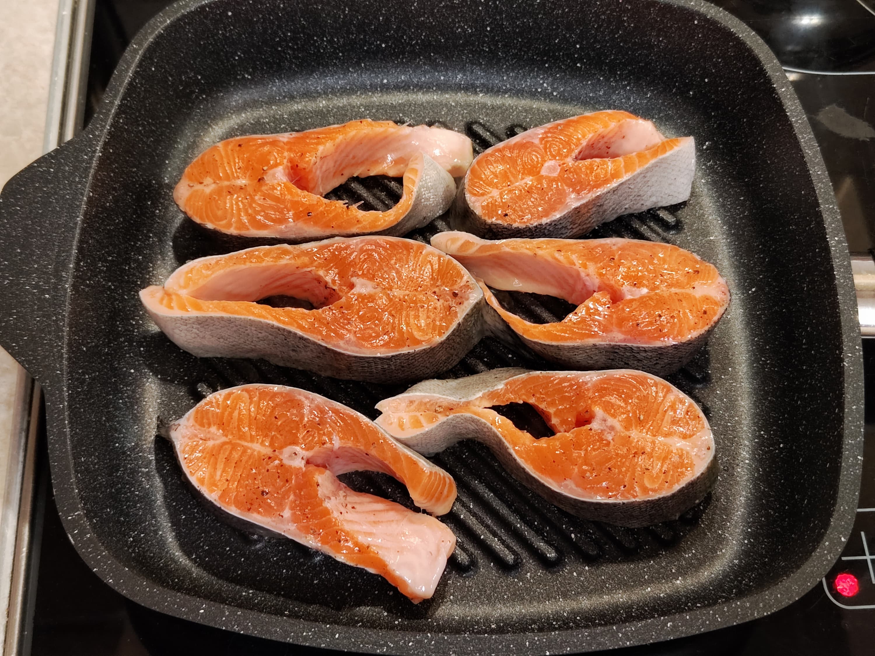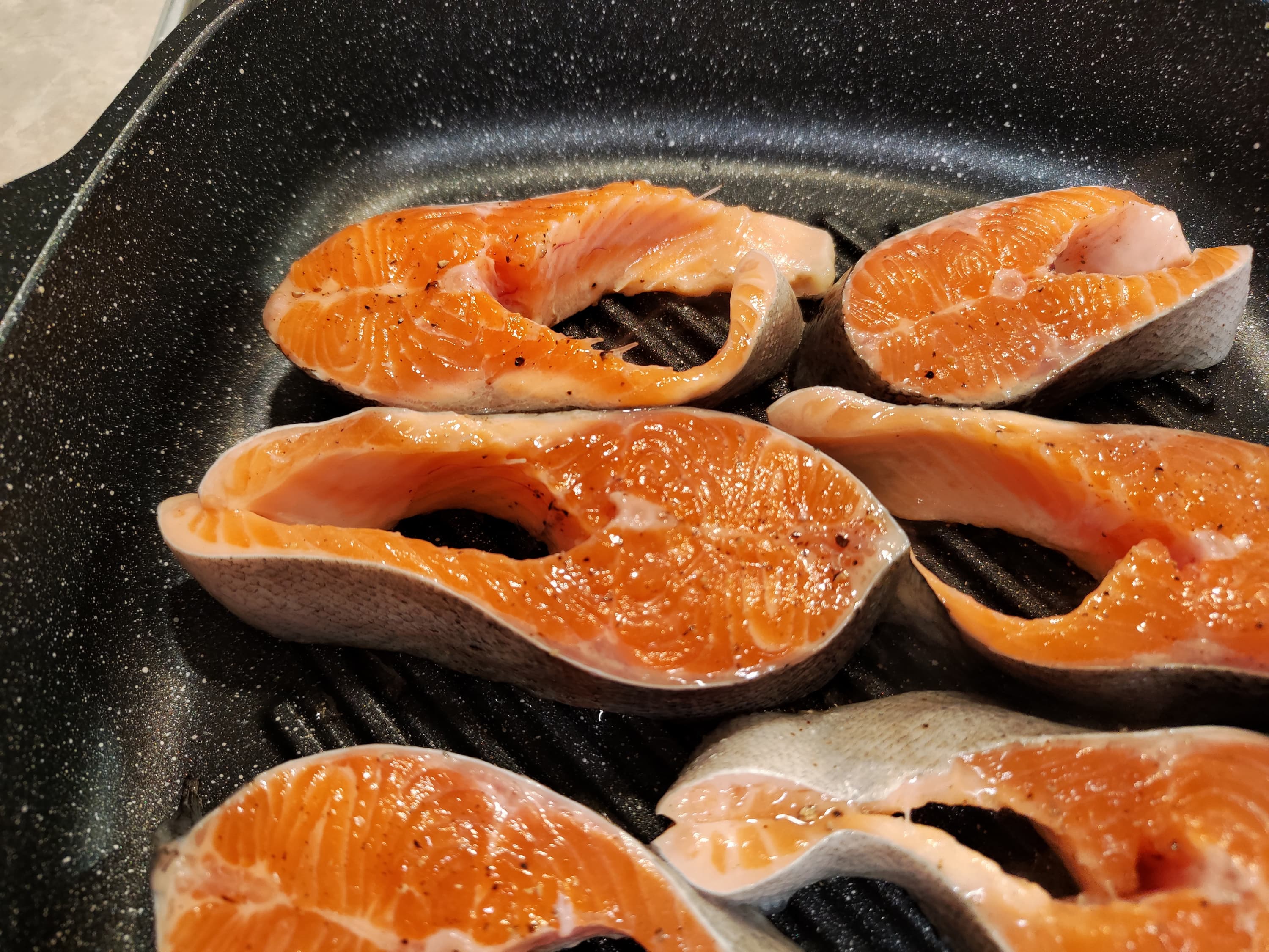 Некрупную полуторакилограммовую форель разделали на стейки, посолили, поперчили и смазали растительным маслом. Уложили на горячую поверхность сковороды и стали с нетерпением ждать результата: прожарится ли рыба изнутри при воздействии температуры лишь с одной стороны, не пересушится ли при этом? На правой фотографии видно, как меняет цвет мякоть форели при готовности. Примерно на этом этапе мы и перевернули кусочки.
