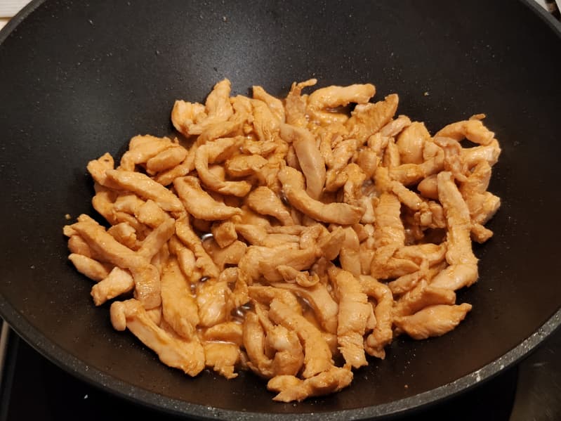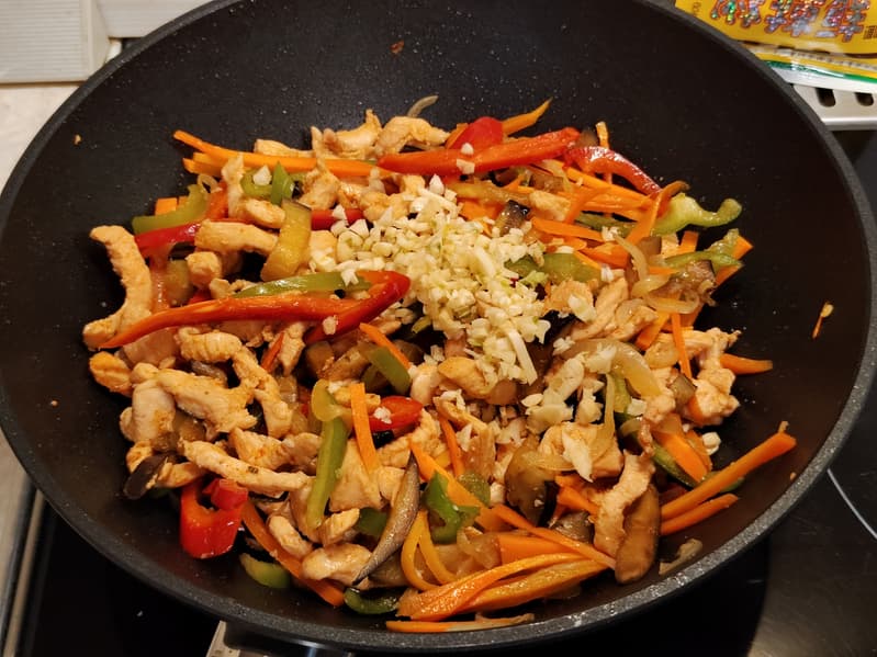 Когда овощи хорошо прогрелись, но перец еще оставался хрустящим, отложили их в миску с луком и морковкой, а в раскаленную сковороду положили кусочки куриной грудки, предварительно замаринованные в смеси соевого соуса и шрирачи. Когда курица достигла готовности, добавили в нее все овощи и рубленый чеснок.
