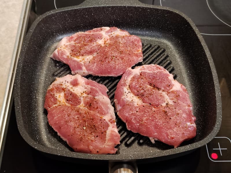 Свиную шею разделали на стейки, посолили, поперчили, смазали маслом и оставили на пару часов мариноваться. Перед жаркой, как мы указывали выше, слегка смазали дно сковороды салфеткой, смоченной в масле. Выложили на раскаленную поверхность три куска свинины.