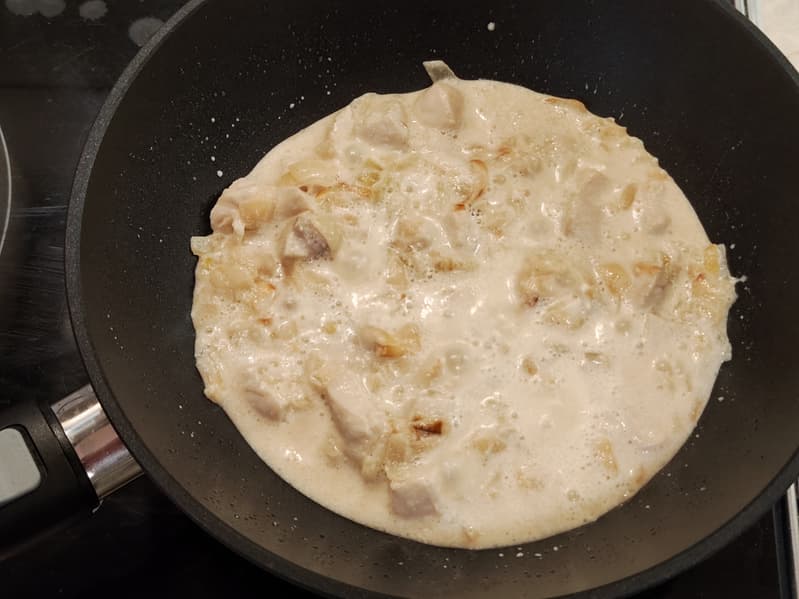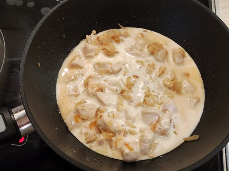 Возможно, блюдо выглядит не очень презентабельно, но вкус получился изумительный — сочетание нежных сливок, сладкого лука и мягкой курицы, не пересушенной долгой тепловой обработкой.