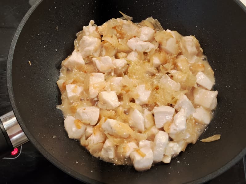 Затем добавили в него нарезанную кусочками куриную грудку. Немного потушили, поскольку курица выделила много влаги. Когда сок испарился, добавили сливки.