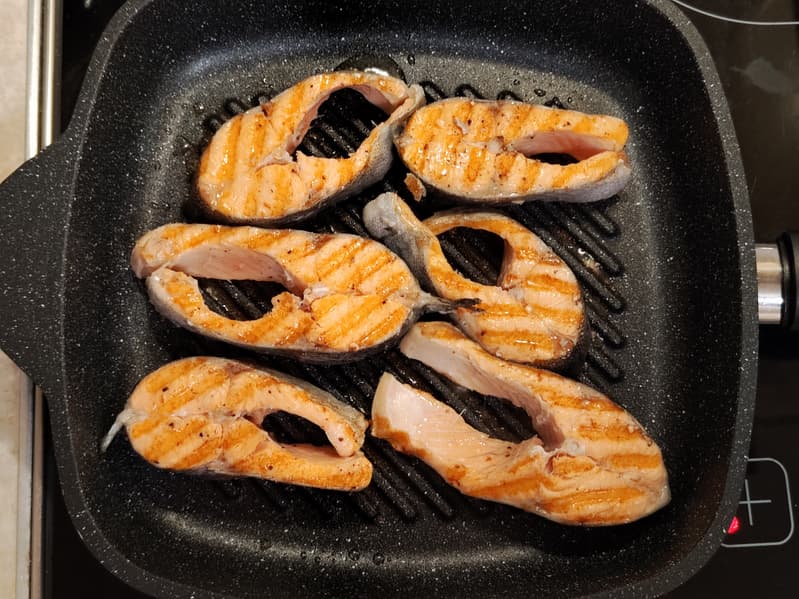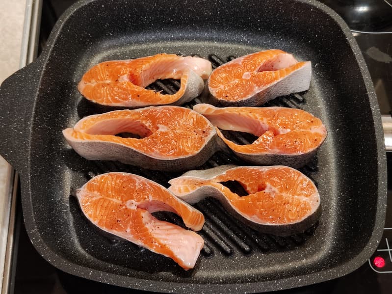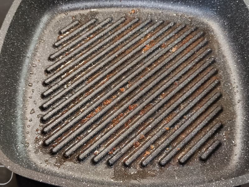 Продукты для жарки мы мариновали и слегка смазывали растительным маслом. Ни разу за время эксплуатации не было замечено прилипания или пригорания продуктов. Жир и жидкость стекают между ребрами, поэтому поверхность продукта прожаривается превосходно.