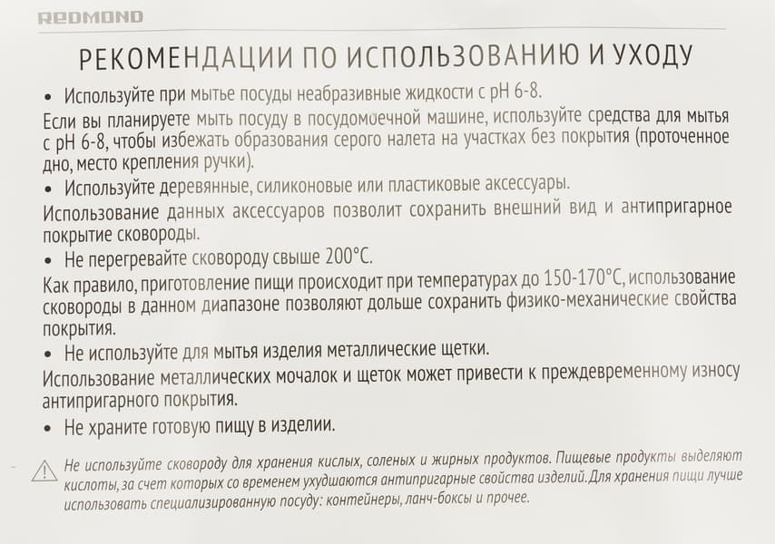 Сковорода-вок PF5505 также сопровождается типовыми для всей посуды «Редмонд» рекомендациями. На плотном глянцевом листе формата А6 дана информация об уходе, эксплуатации и процедуре фиксации и съема ручки.