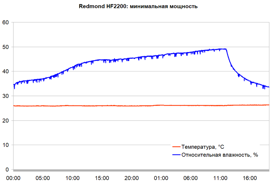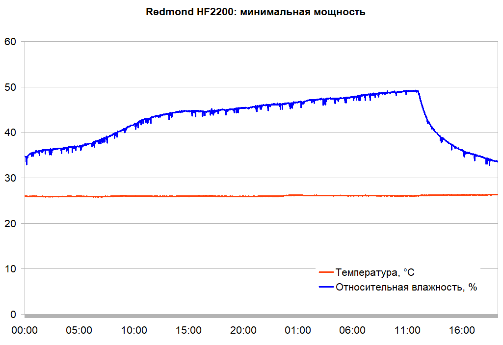 Включив прибор в автоматическом режиме и активировав функцию «теплый пар», мы оставили его на продолжительное время и дождались сообщения о закончившейся в баке воде. Результаты измерений можно видеть на графике.