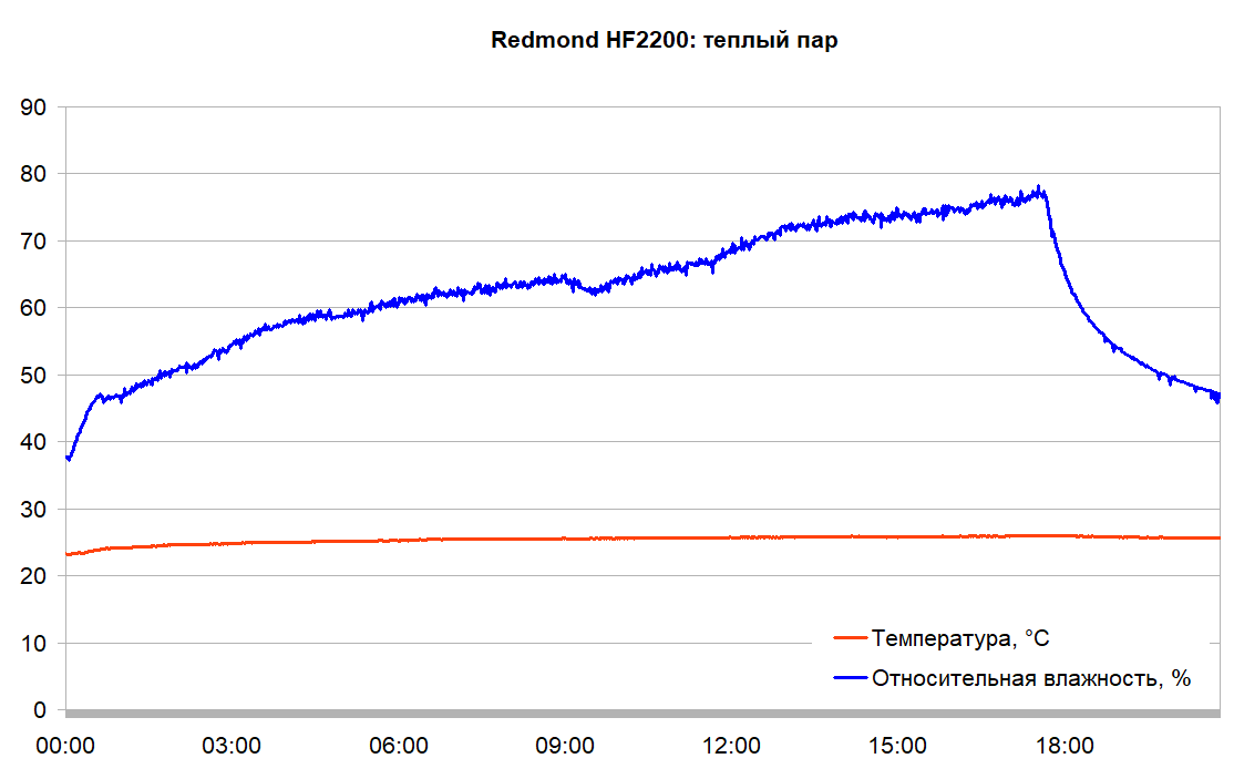 Стартовав в помещении c влажностью около 36%, прибор проработал до опустошения бака почти 18 часов. Все это время влажность в помещении поднималась, достигнув к концу теста 77%. Рекордным достигнутый результат назвать никак нельзя, но при длительной работе в этом режиме прибор способен насытить атмосферу влагой в помещении до комфортного уровня.