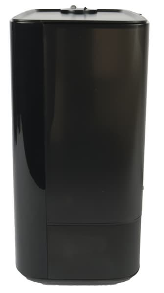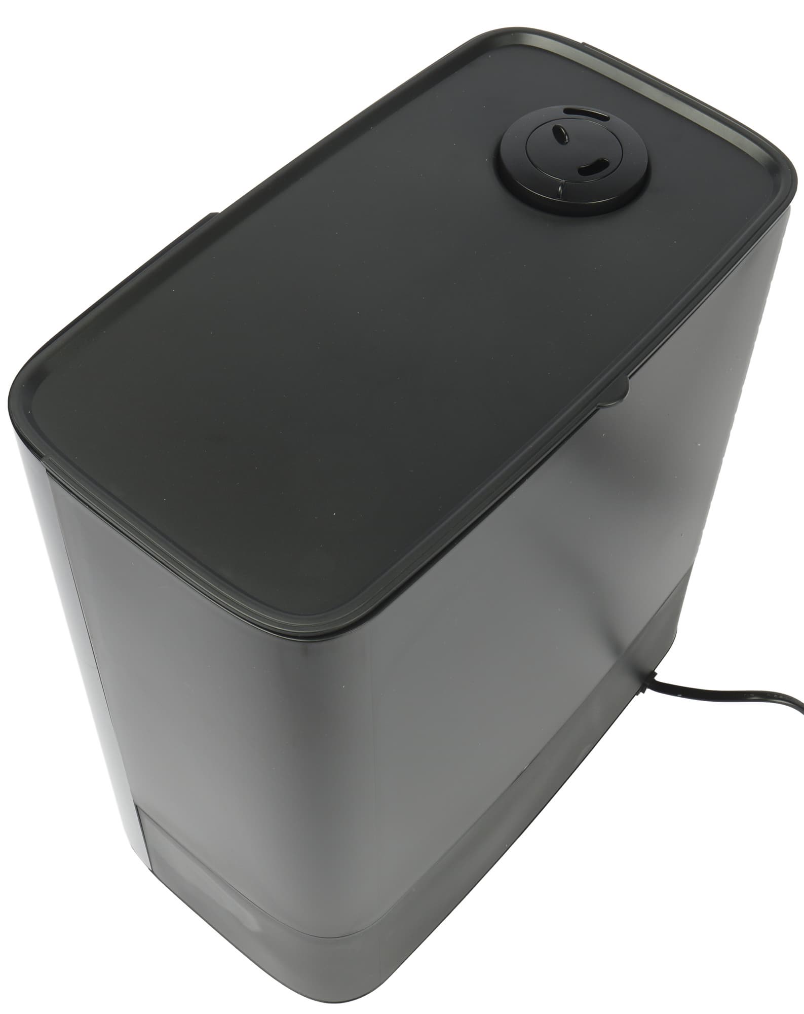 Черный пластиковый корпус увлажнителя имеет форму параллелепипеда со скругленными углами. Чуть меньше половины передней панели занимает светодиодный дисплей с сенсорным управлением. Индикация на выключенном приборе не видна. Мы рассмотрим эту часть устройства чуть дальше.