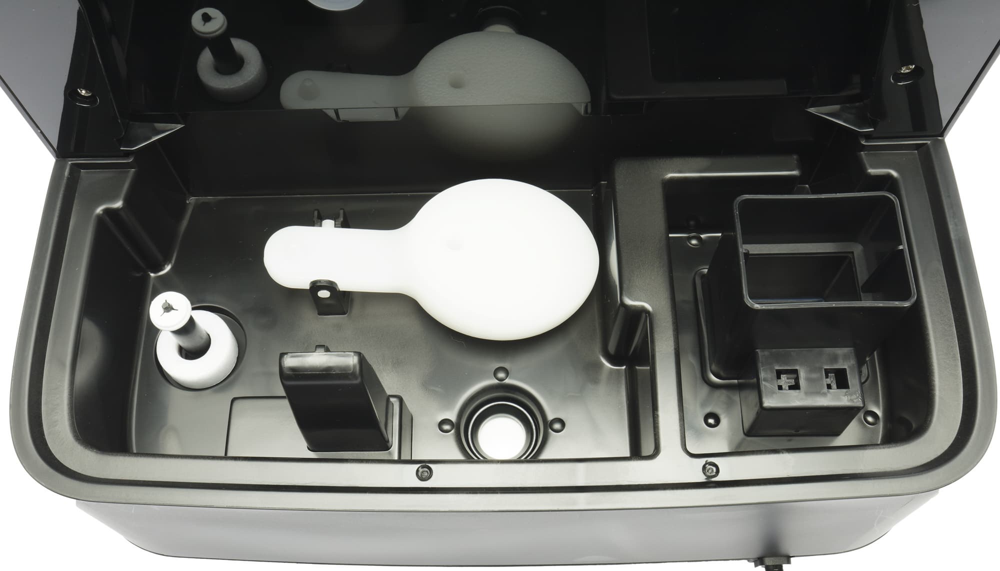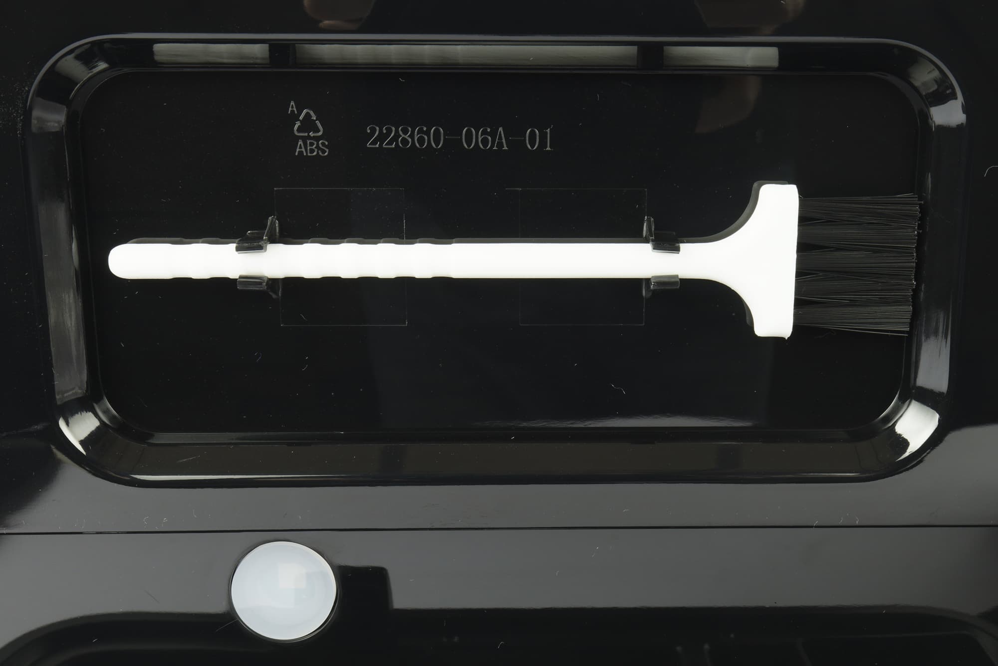 В специальном отсеке на внутренней стороне корпуса скрывается небольшая щетка, предназначенная для ухода за поверхностью рабочей камеры. Рядом с ней — круглый плафон светодиодной подсветки, позволяющей рассмотреть содержимое резервуара.