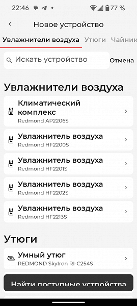 После нажатия на кнопку «Добавить устройство» мы попадаем на экран выбора поддерживаемых моделей. Автоматическое добавление устройства в нашем случае не сработало: пришлось вручную выбрать «Redmond HF2201S» на вкладке «Увлажнители воздуха».