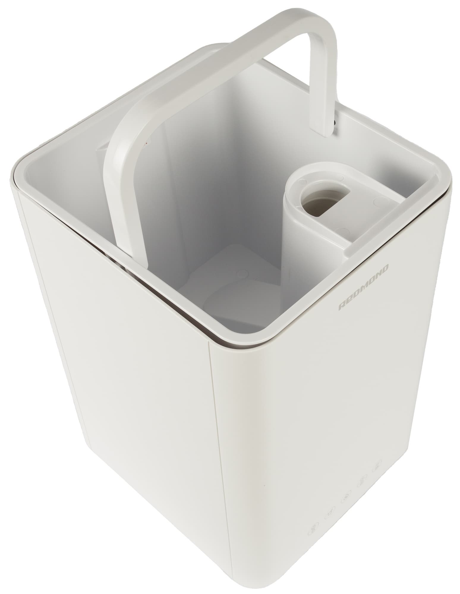 Под крышкой расположен съемный бак для воды. Его можно извлечь с помощью откидной ручки.