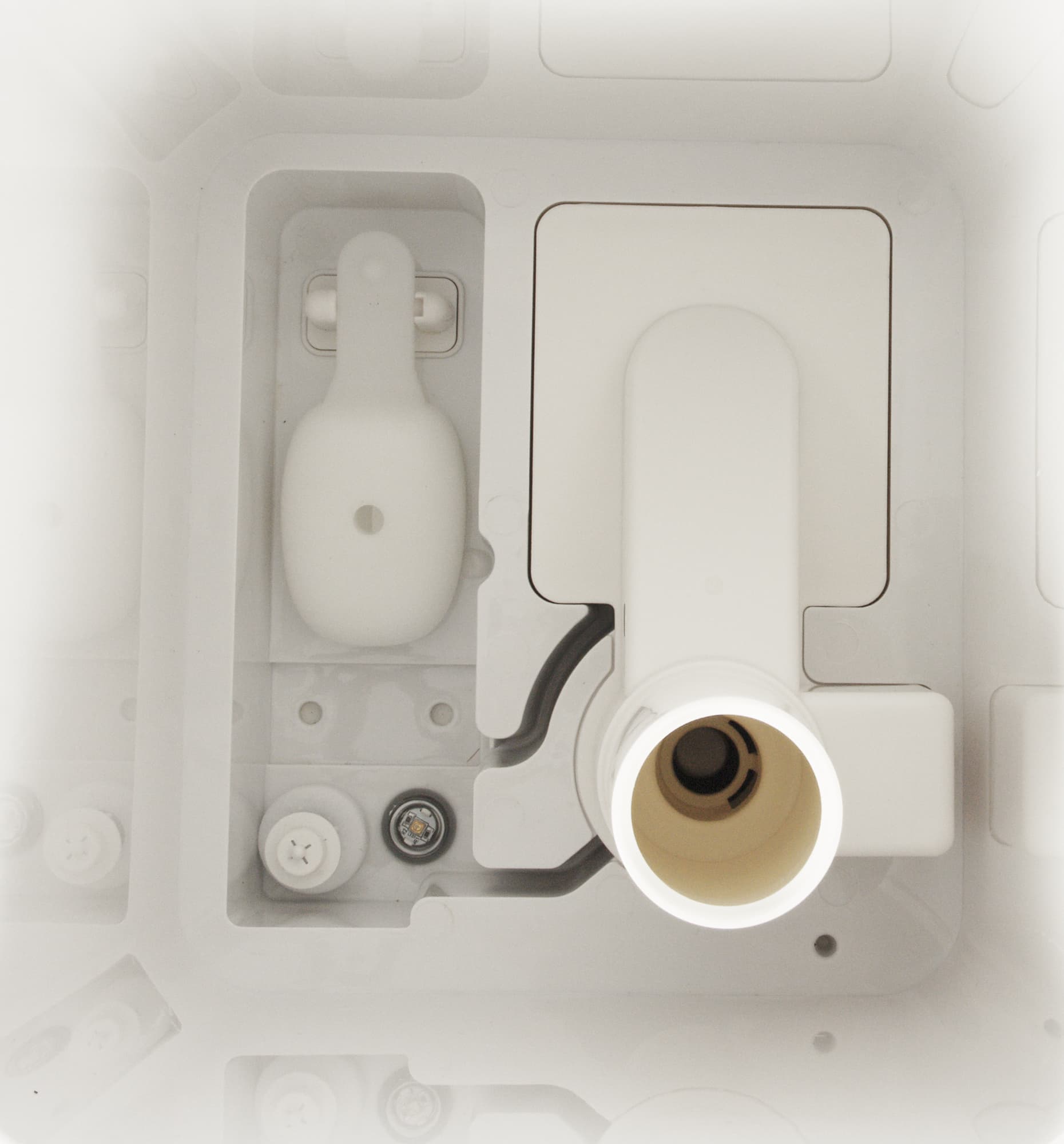 Справа устанавливается пластиковая трубка распылителя, а под ней мы найдем ультразвуковую мембрану, которая превращает воду в холодный пар и небольшой резиновый поддон для добавления ароматических масел.