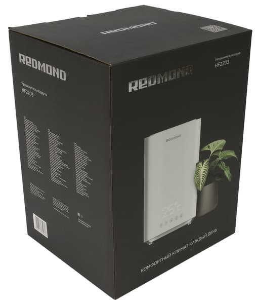 Коробка, в которой поставляется увлажнитель, оформлена в фирменном стиле Redmond: на темно-сером фоне оказалась размещена фотография устройства, индекс модели, логотип и слоган «Комфортный климат каждый день». Для красоты рядом поставили домашнее растение.