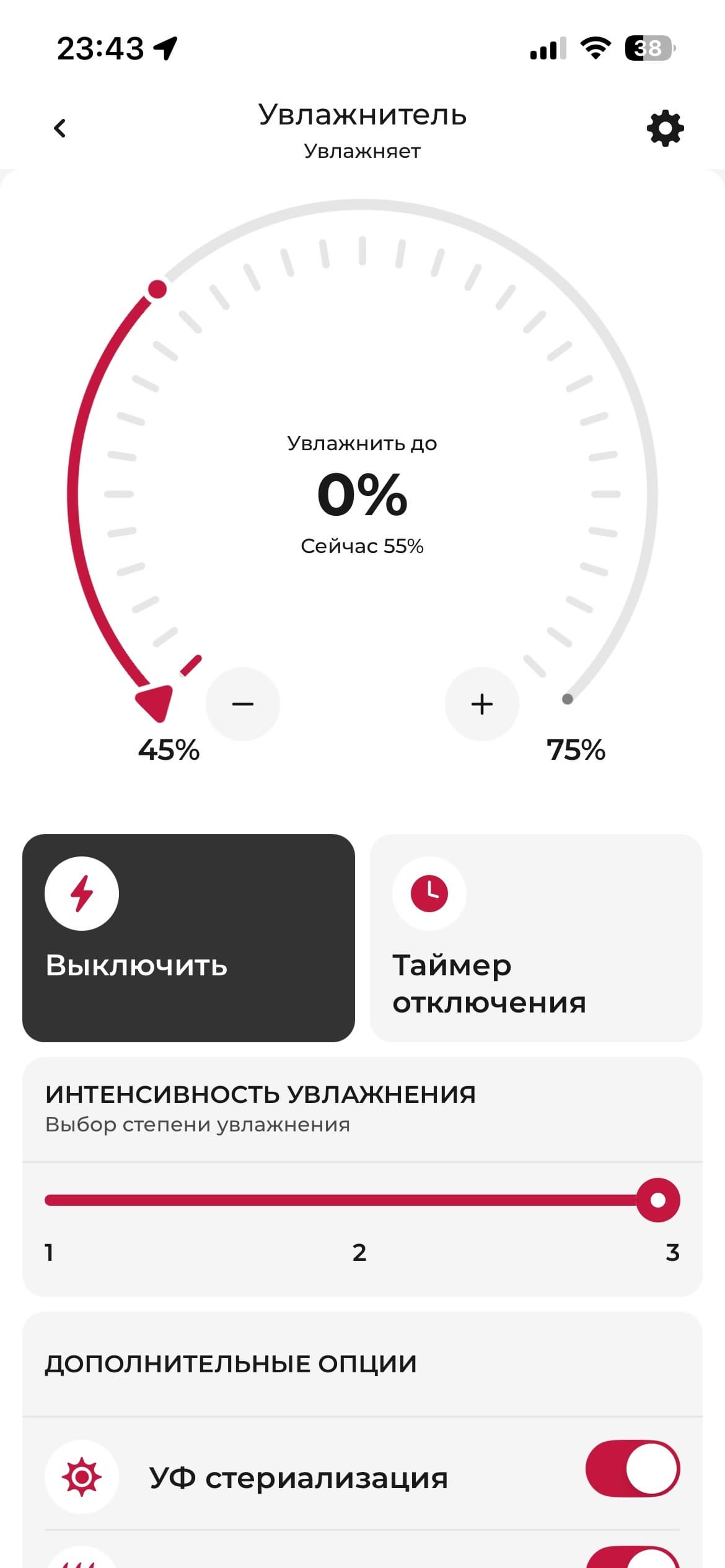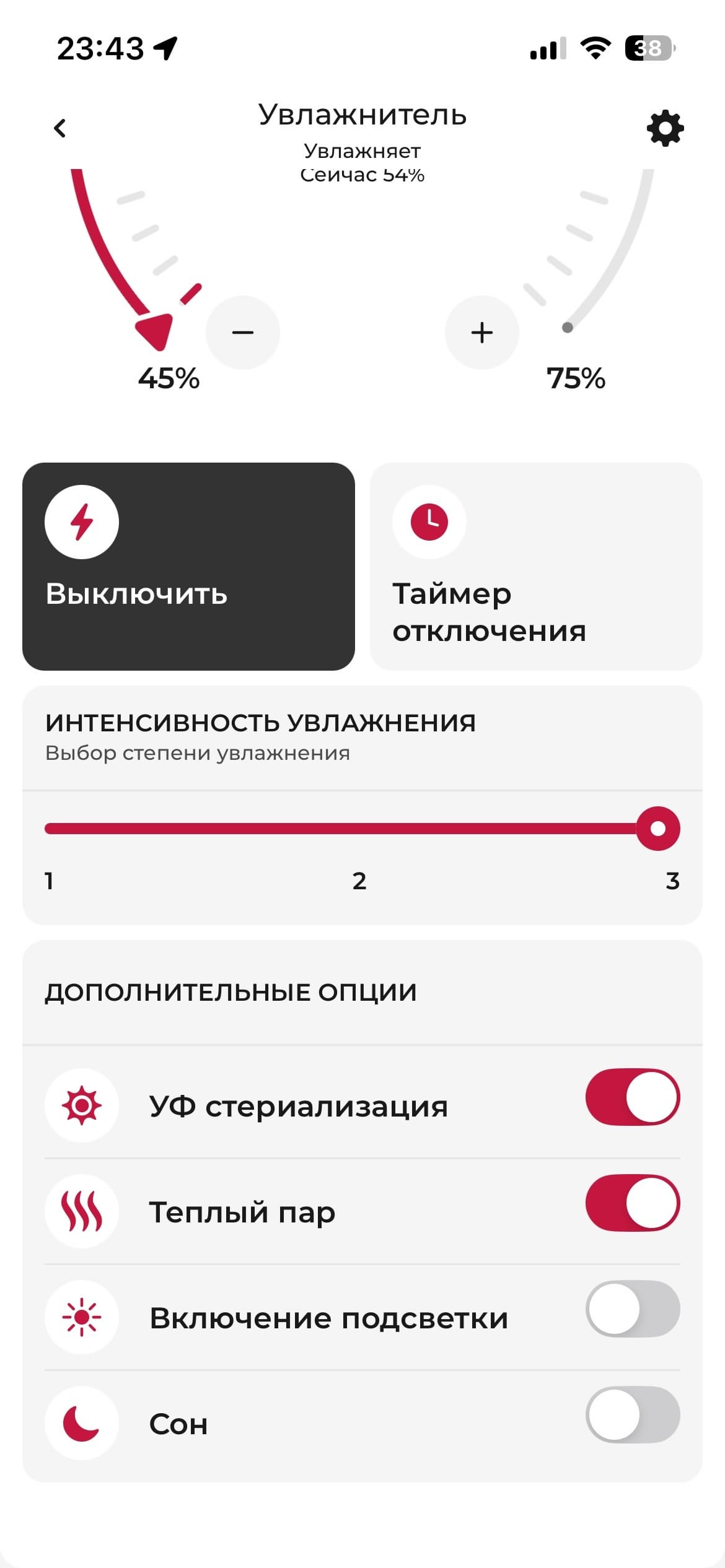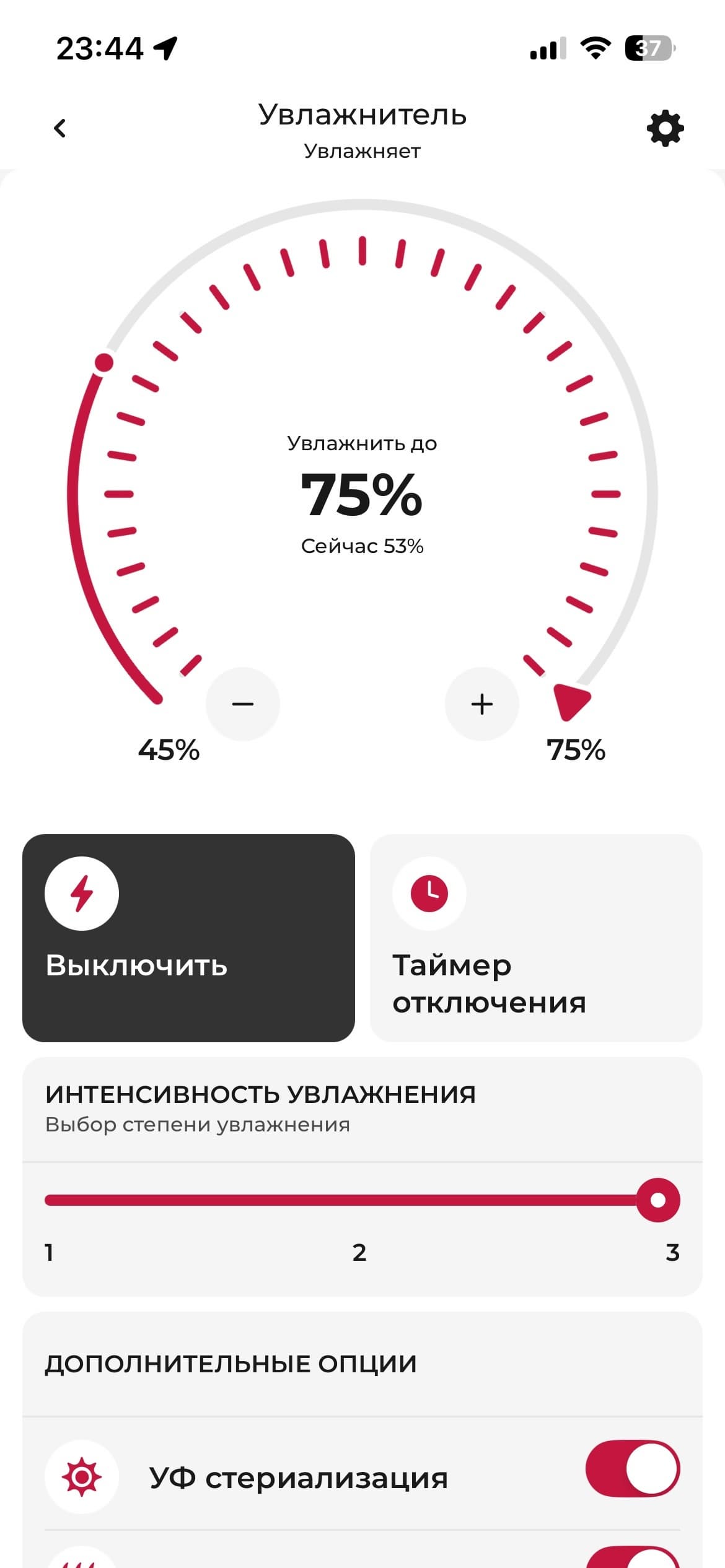 Приложение на смартфоне полностью дублирует управление с корпуса устройства. Оно не расширяет функциональность увлажнителя, но значительно упрощает его использование. Это можно считать преимуществом: пульт ДУ легко потерять, а смартфон почти всегда под рукой.