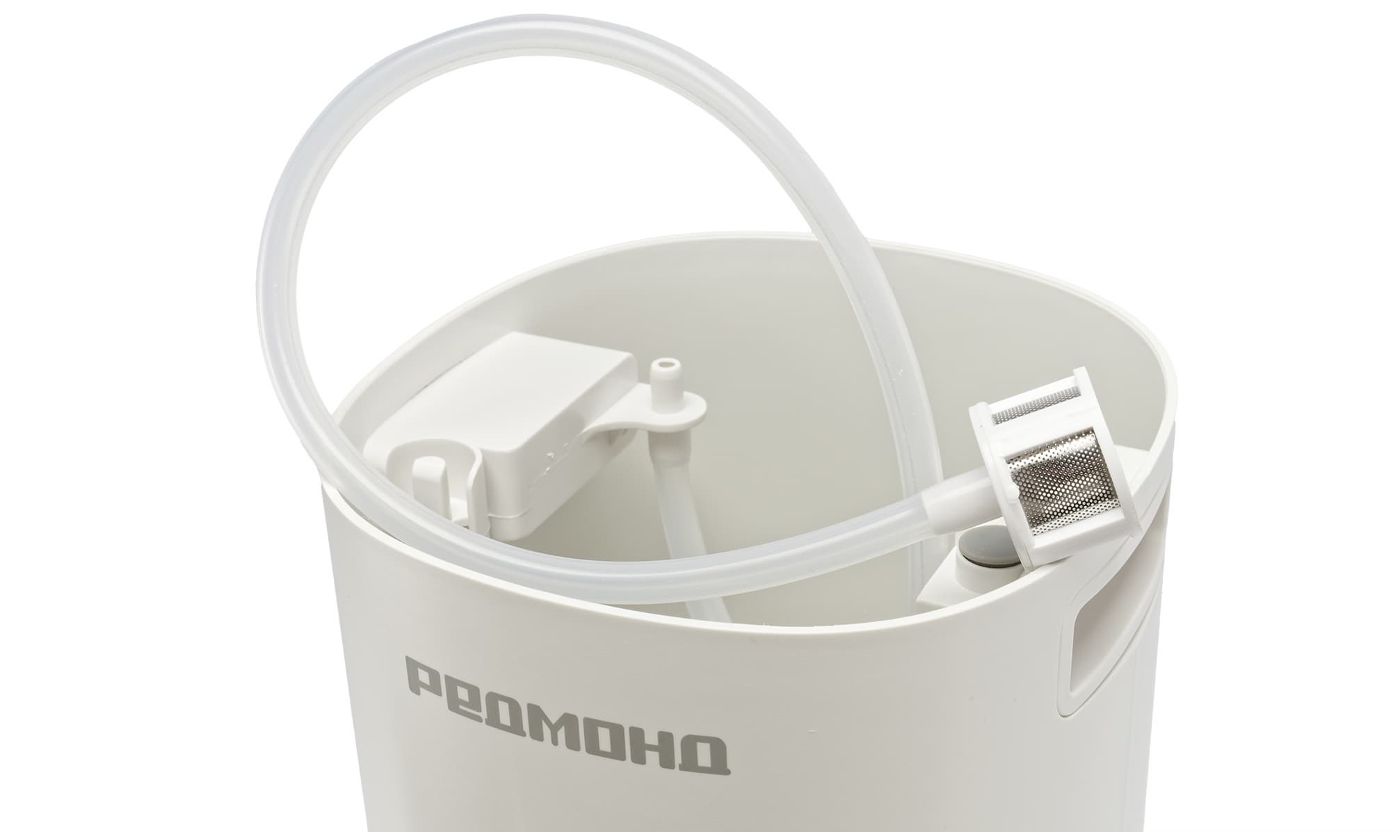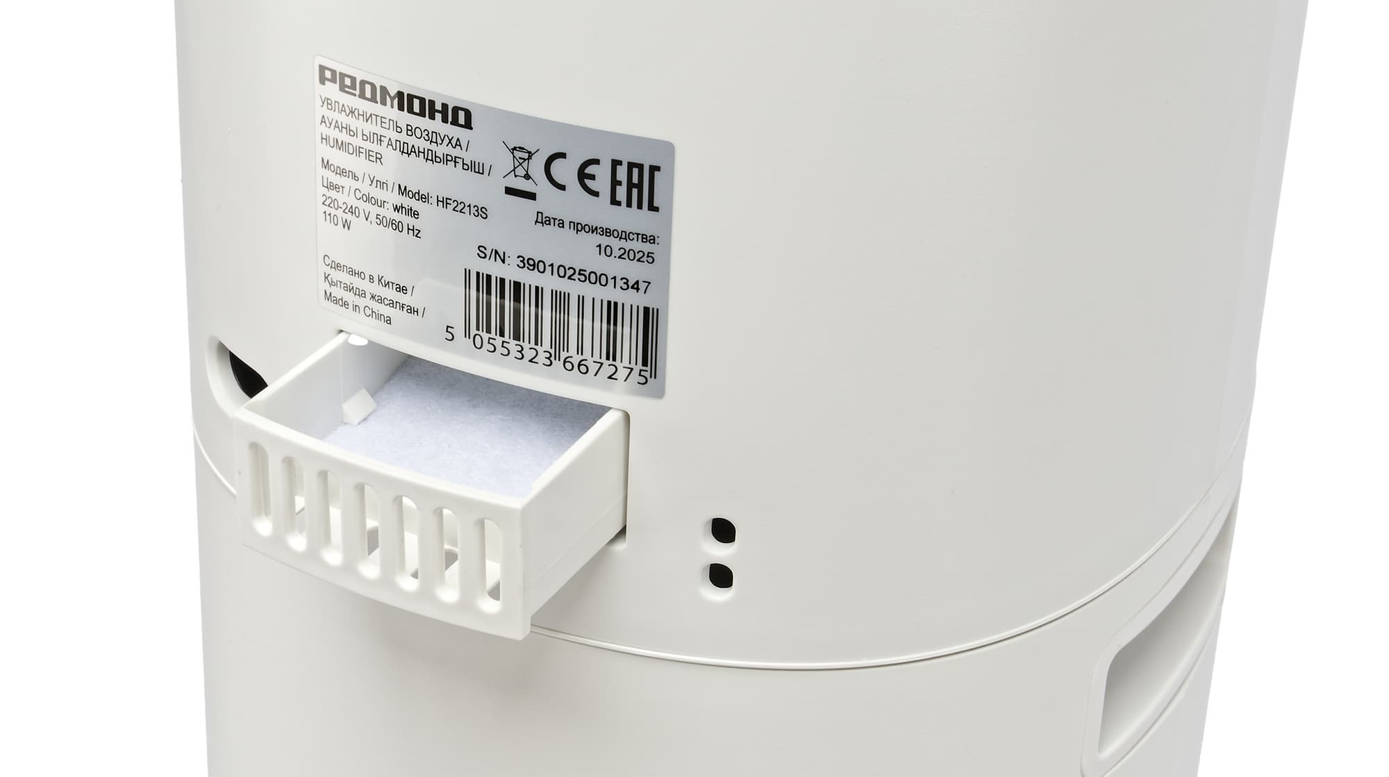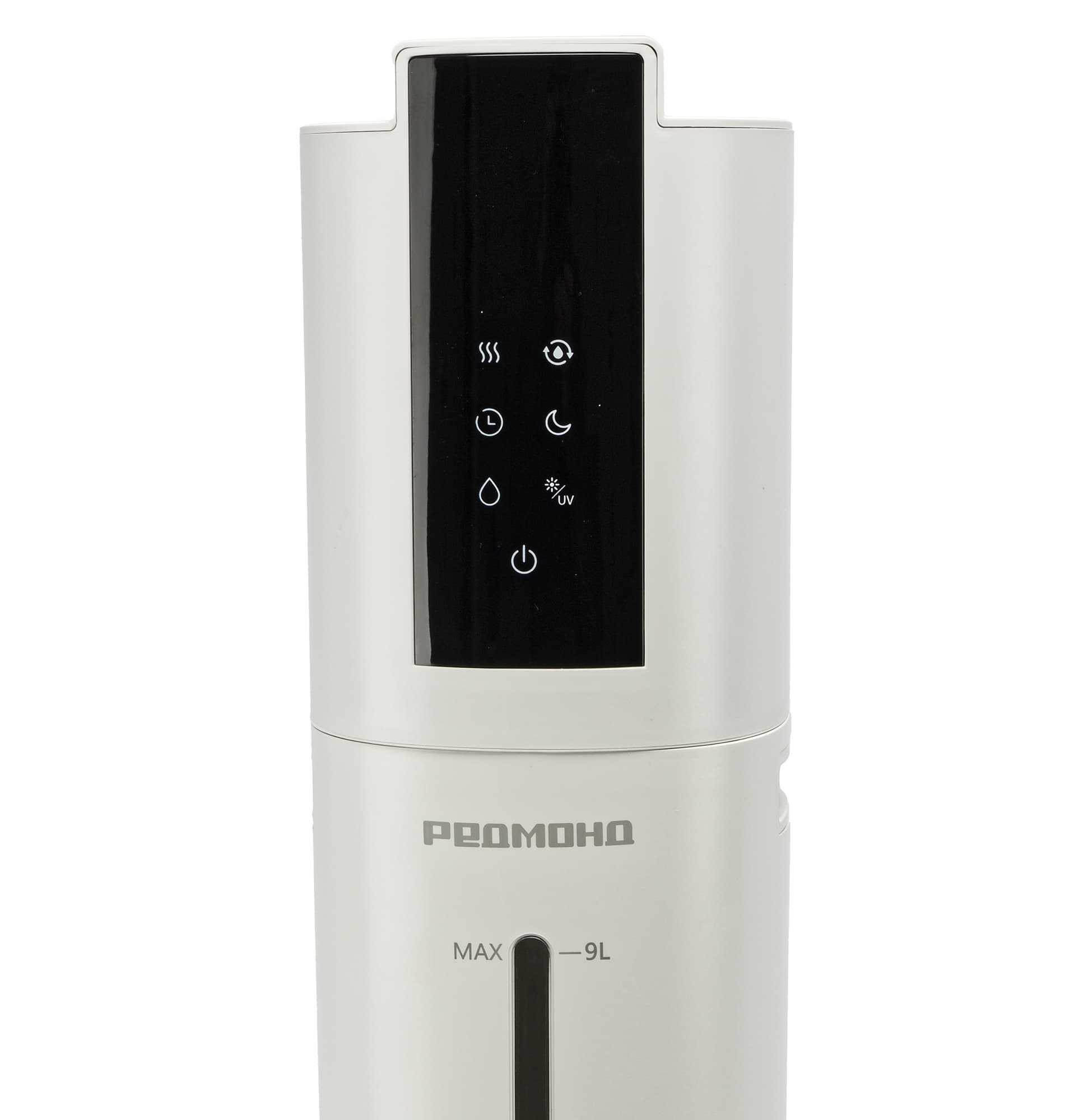 Герой сегодняшней статьи — паровой увлажнитель Redmond HF2213S с большим объемом бака (9 литров). Он отличается от большинства своих ультразвуковых товарищей тем, что помимо классической функциональности, имеет и режим «Теплый пар», при котором использует в работе принцип стерильного увлажнения: вода из бака поступает в специальный поддон, там нагревается и испаряется.