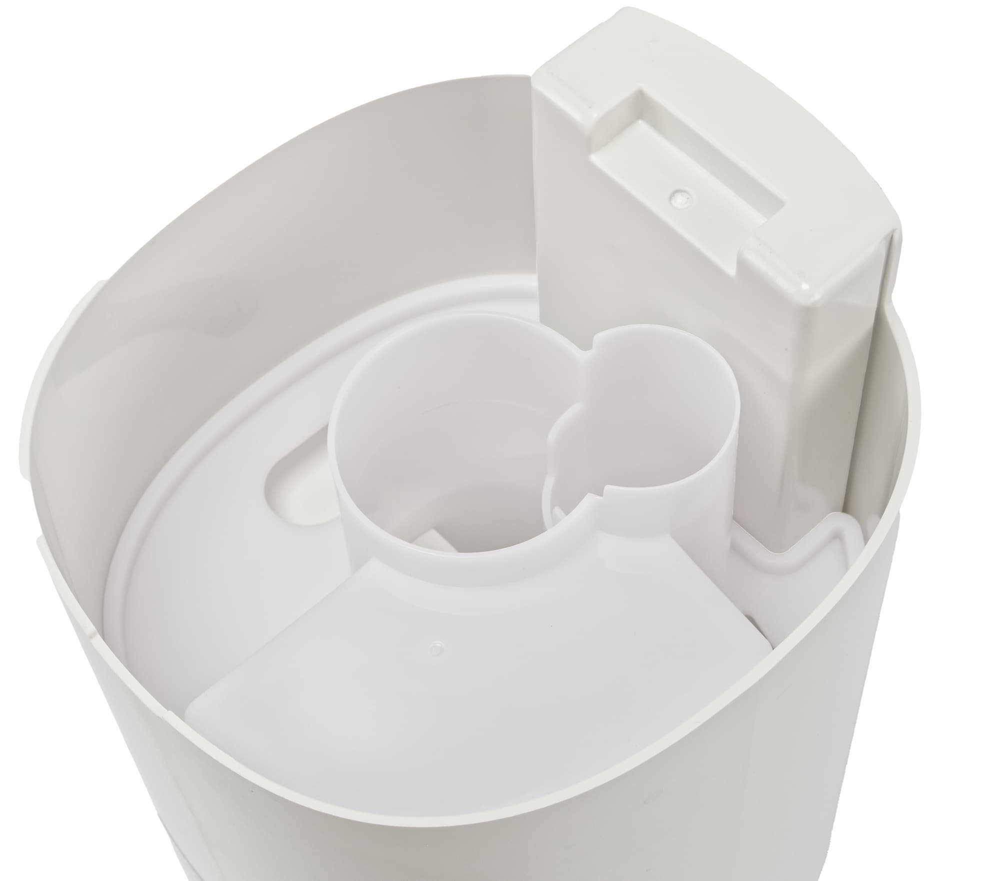 Снимем верхнюю панель увлажнителя и разглядим под ним резервуар из белого пищевого пластика. Объем бака для воды впечатляющий — целых 9 литров, поэтому для удобства переноса предусмотрены специальные выемки по бокам.