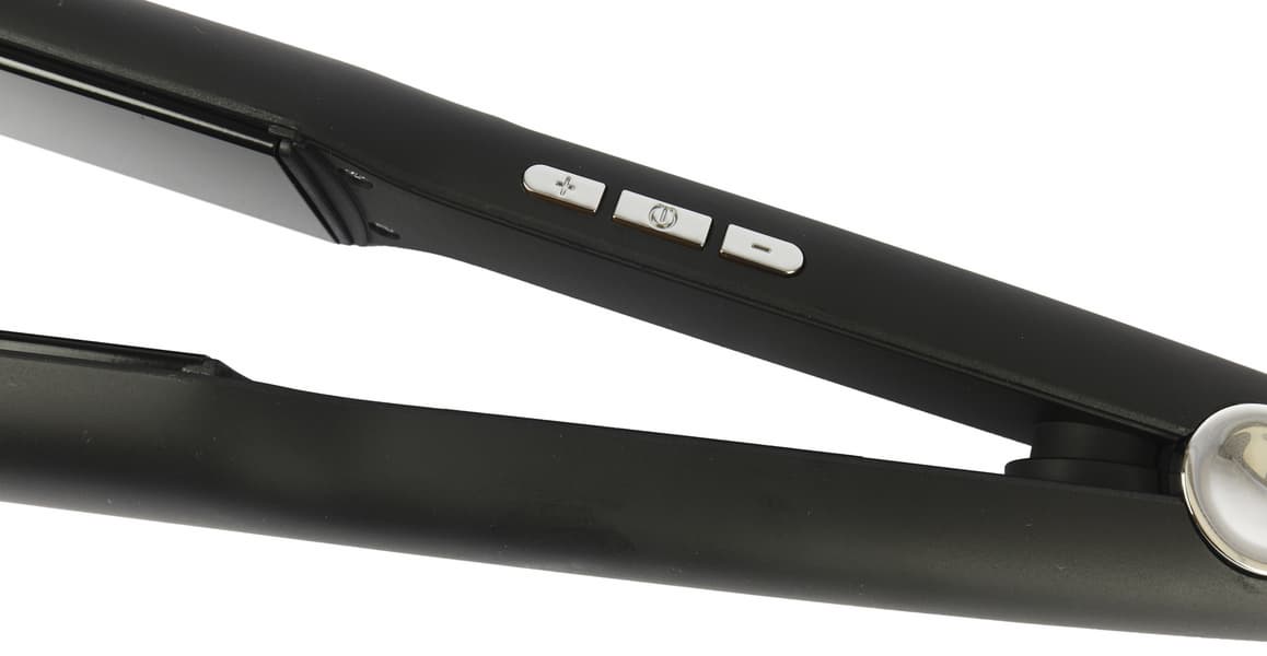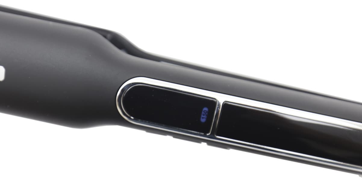 Из минусов мы отметили сильный нагрев корпуса в местах расположения пластин — на максимальной температуре дотрагиваться до пластика у края прибора крайне неприятно даже не смотря на наличие выпуклого рисунка. Эта проблема решается захватом прибора в районе дисплея — можно вовсе не трогать обжигающие части прибора и зажимать пластины стайлера холодной ручкой.