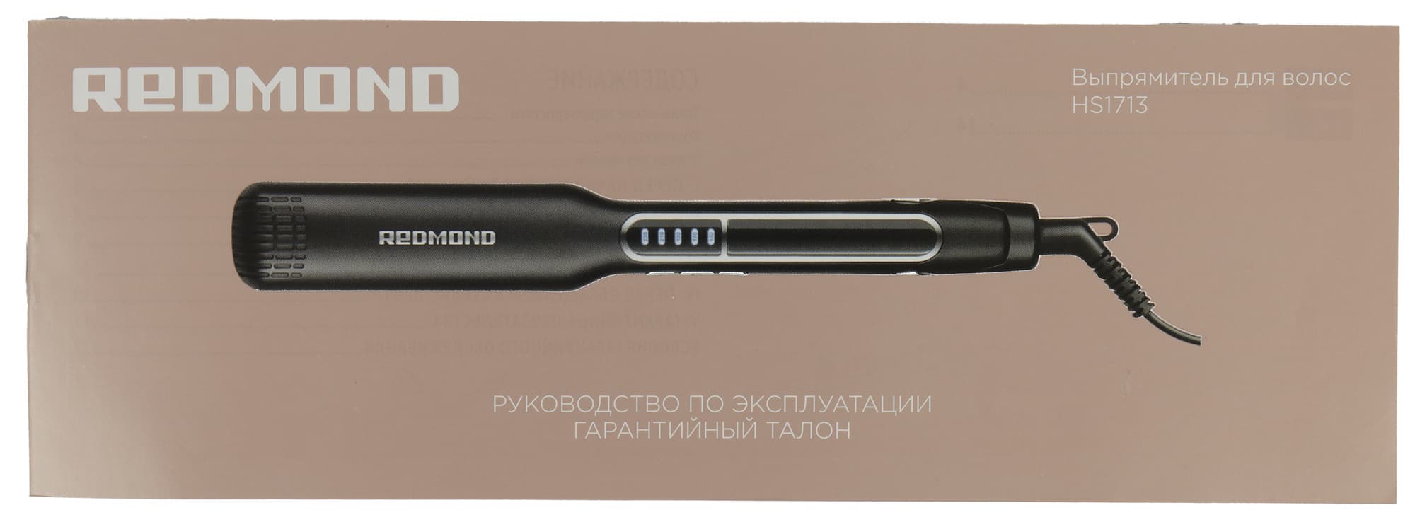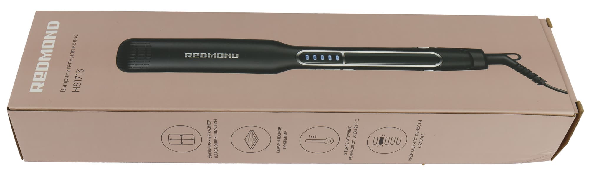 Стайлер упакован в небольшую картонную коробку прямоугольной формы пыльно-розового цвета. На лицевой стороне размещена фотография прибора, логотип компании и наименование модели устройства.