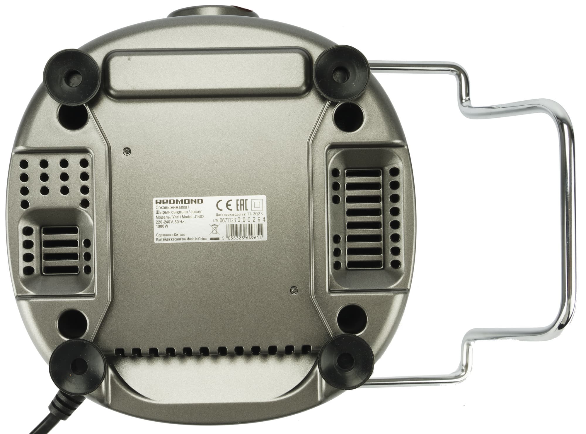 Благодаря четырем прорезиненным ножкам-присоскам прибор устойчиво располагается на поверхности стола. Также на дне размещены вентиляционные отверстия и шильда с информацией о приборе.