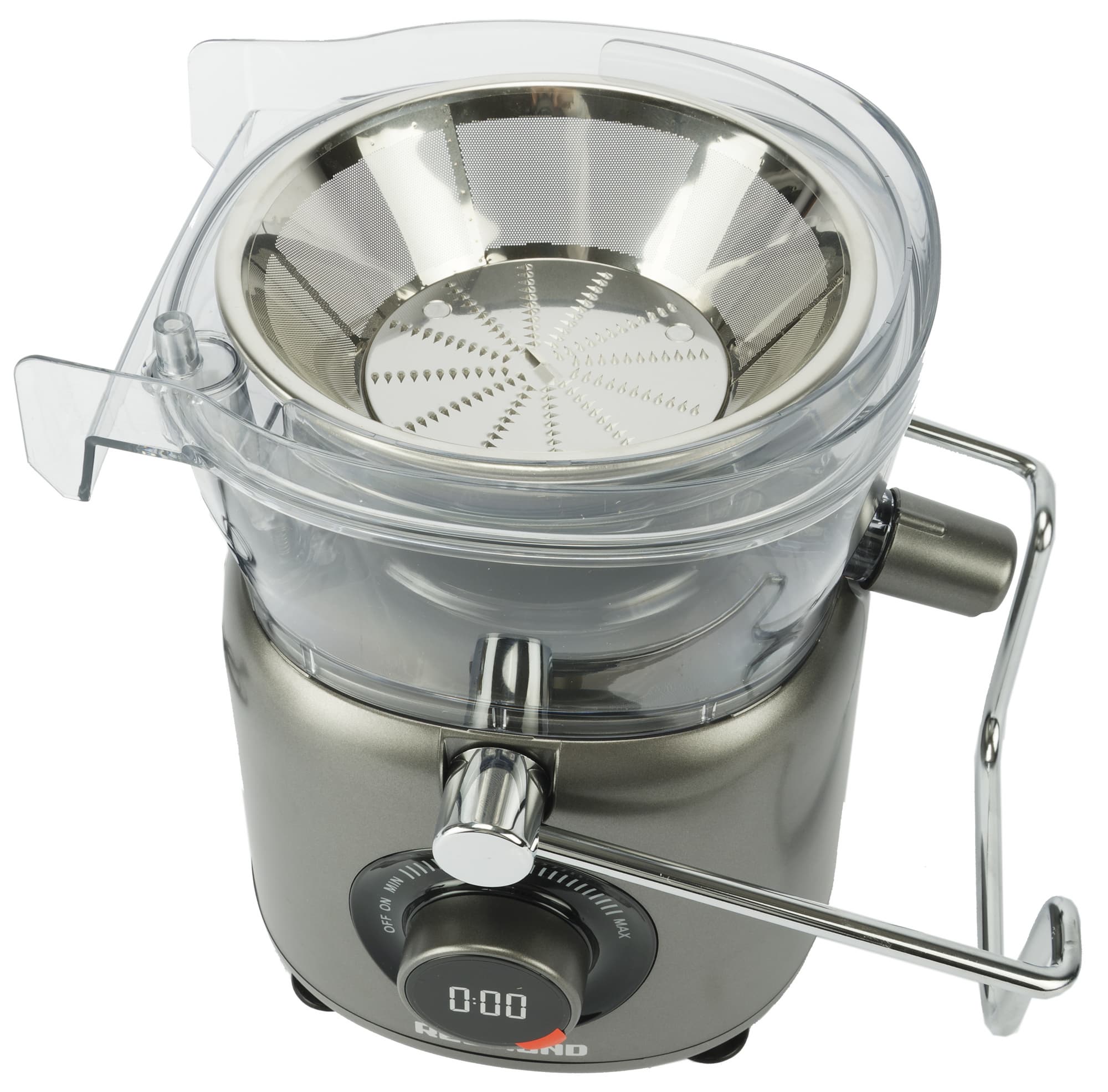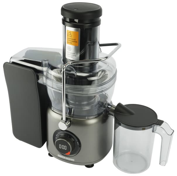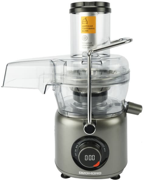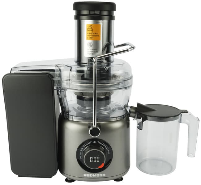 Управление соковыжималкой предельно простое. Необходимо повернуть регулятор скорости — от минимума до максимума — и установить необходимую скорость. На ЖК-дисплее высвечивается время работы прибора, поскольку нельзя на максимальной скорости отжимать сок дольше 1 минуты.