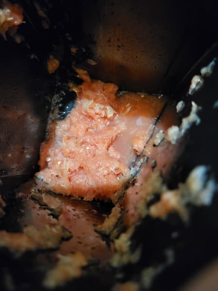 На фото ниже можно увидеть жмых, оставшийся после переработки яблок — с довольно крупными фрагментами, а также фото сепаратора и кусок яблока, который на нем остался после переработки. Также на яблоке видны точки от толкателя, которым все же не удалось протолкнуть яблоко до конца.