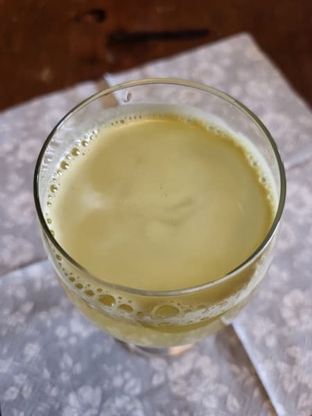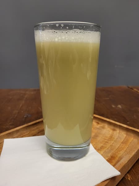 Пены получилось немало, сам сок — с небольшим количеством мякоти, плотный.