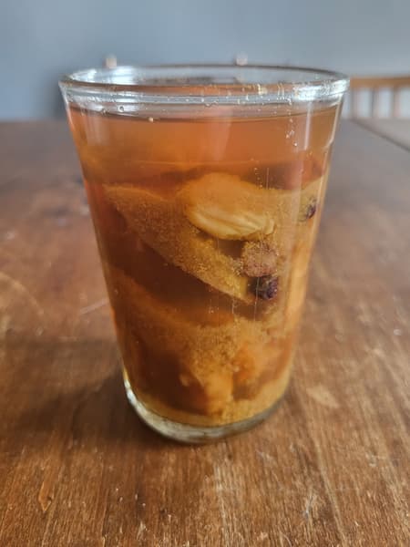 А потом мы добавили в выжатый сок сухофрукты и сделали компот. Получилось потрясающе, хотя, возможно, перед варкой компот следовало процедить: в стакане видны хлопья сварившейся пены.