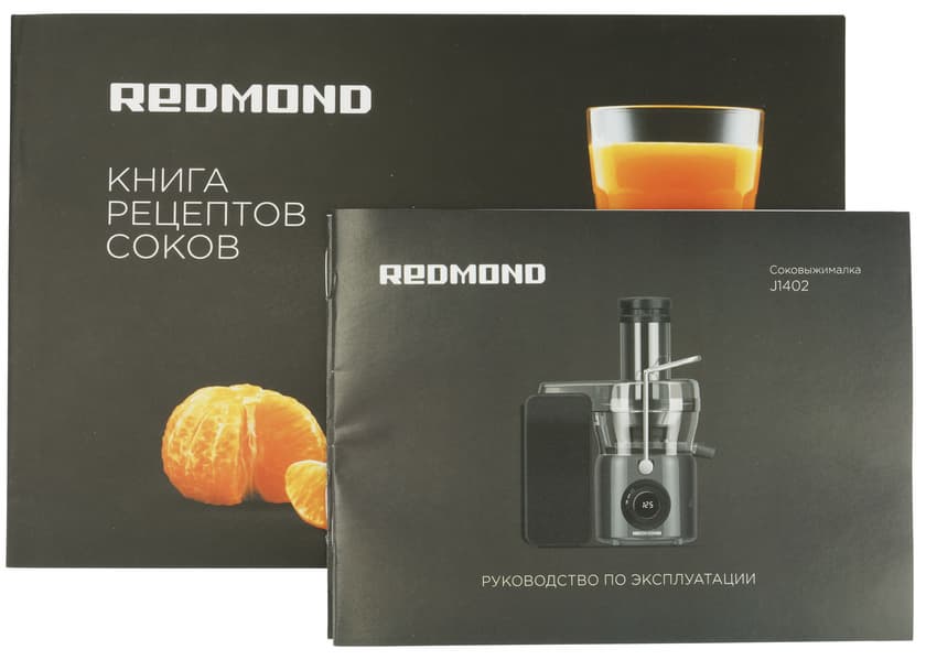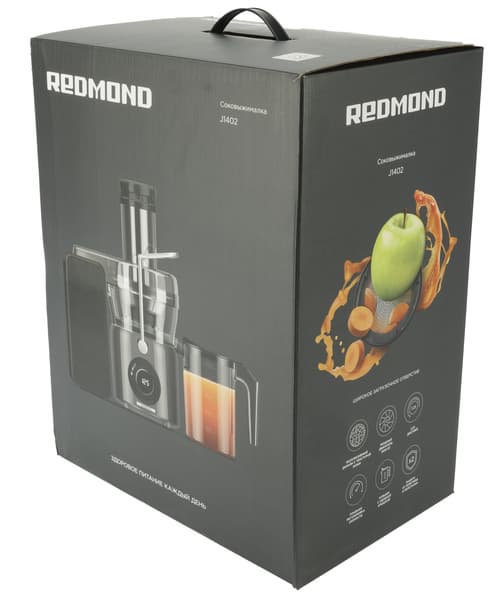 Соковыжималка Redmond J1402 прибыла на тестирование в картонной коробке, оформленной в фирменном стиле Redmond: фотографии на черном фоне. На лицевой стороне — фотография соковыжималки с кувшином, полным сока, а на боковой стороне — фото яблока и моркови, из которых льется сок. Также на боковых сторонах коробки кратко обозначены основные характеристики и особенности прибора.