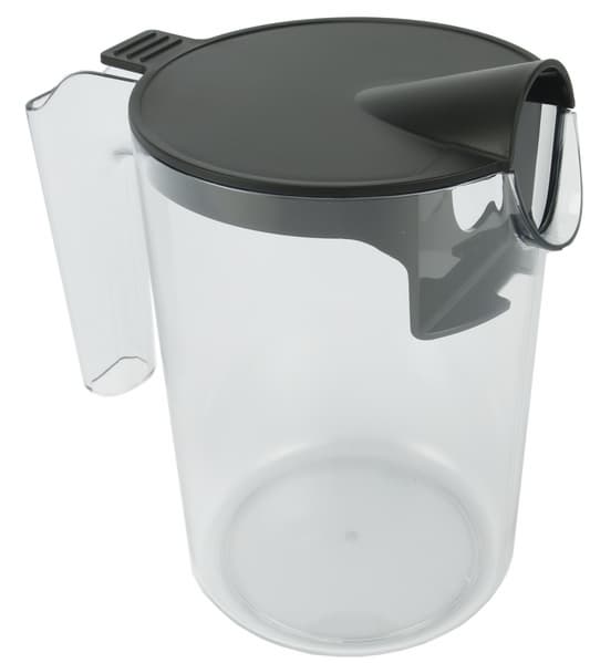 Контейнер для сока объемом 1 л изготовлен из прозрачного пластика и снабжен крышкой и ручкой. Также на нем есть шкала с рисками в мл. Крышка снимается.