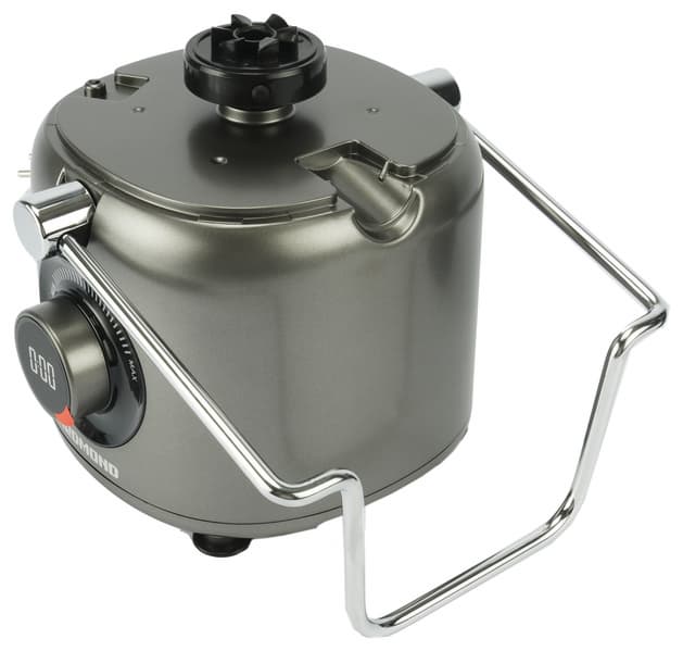 Моторный блок соковыжималки массивен и устойчив. В центре передней панели находится ручка переключения скоростей с ЖК-дисплеем, отображающим время работы прибора, сверху — муфта приводного вала.