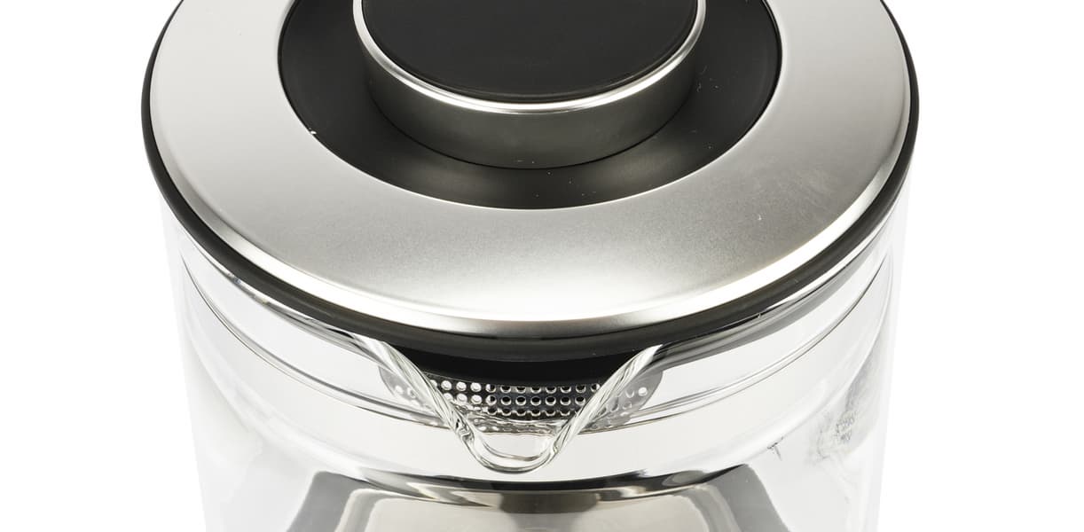 С внутренней стороны по периметру расположено уплотняющее силиконовое кольцо, благодаря которому крышка надежно садится на колбу. Сбоку привинчен металлический фильтр.