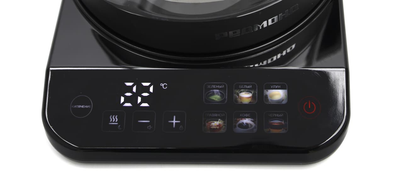 Панель управления Redmond KG220 состоит из 11 сенсоров и дисплея, на котором во время работы отображается текущая температура воды. При подключении к сети на несколько секунд загорится вся панель, а после красным будет светиться только кнопка включения. При нажатии на нее активируется вся панель.