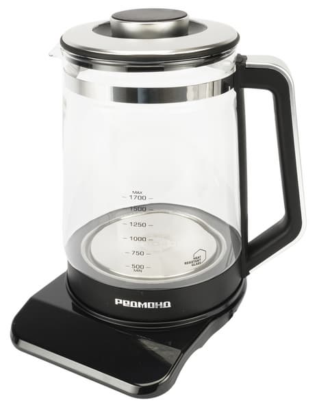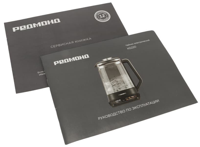 Корпус и база Redmond KG220 выполнены из пластика, а колба — из стекла. На крышке и с внешней стороны ручки есть вставки из серебристого металла.