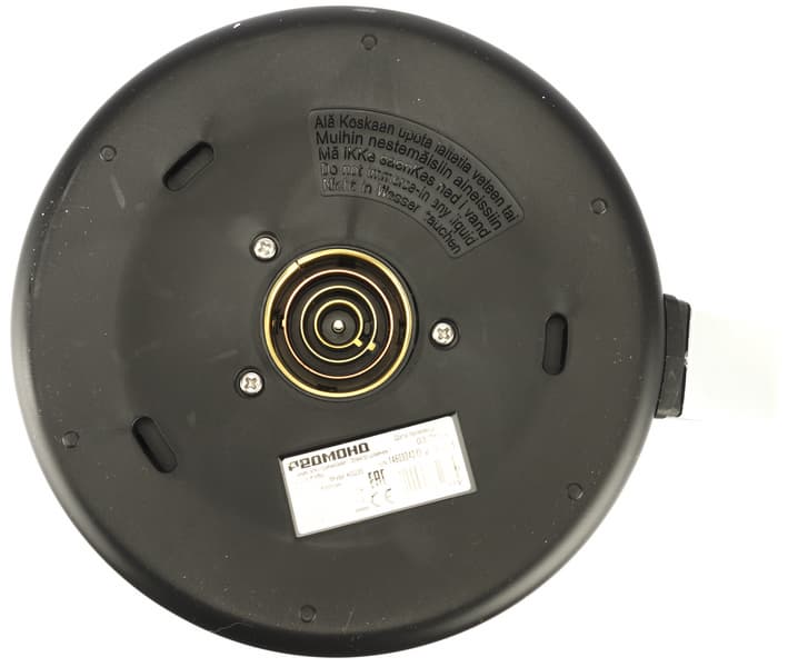 На дне чайника находится шильдик с краткой технической информацией о приборе и контактная группа.