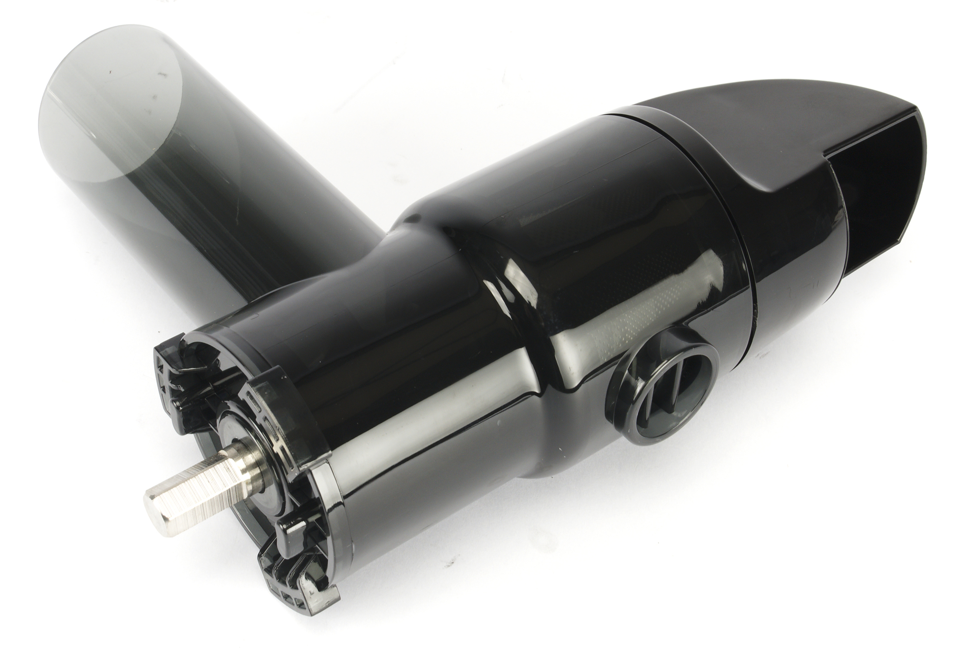 Блок соковыжималки включает в себя небольшой пластиковый загрузочный лоток с толкателем, сетчатый металлический фильтр, увесистый шнек с пластиковым покрытием и крышку с отверстием для выхода жмыха.