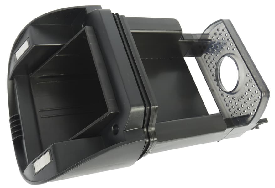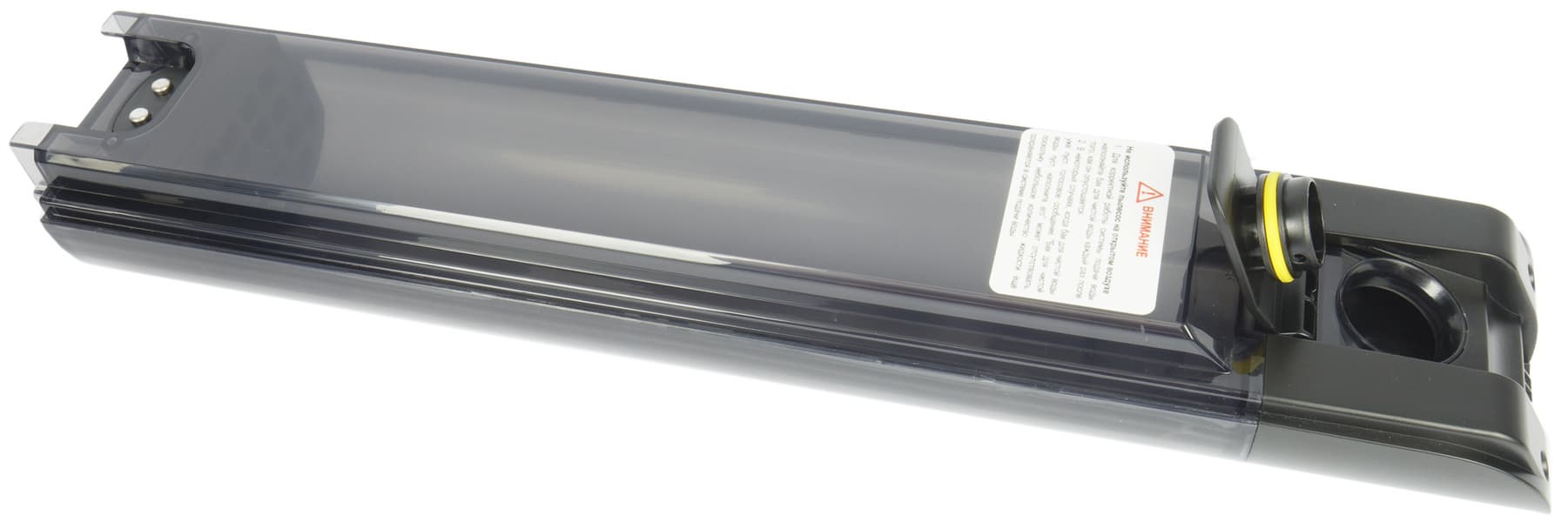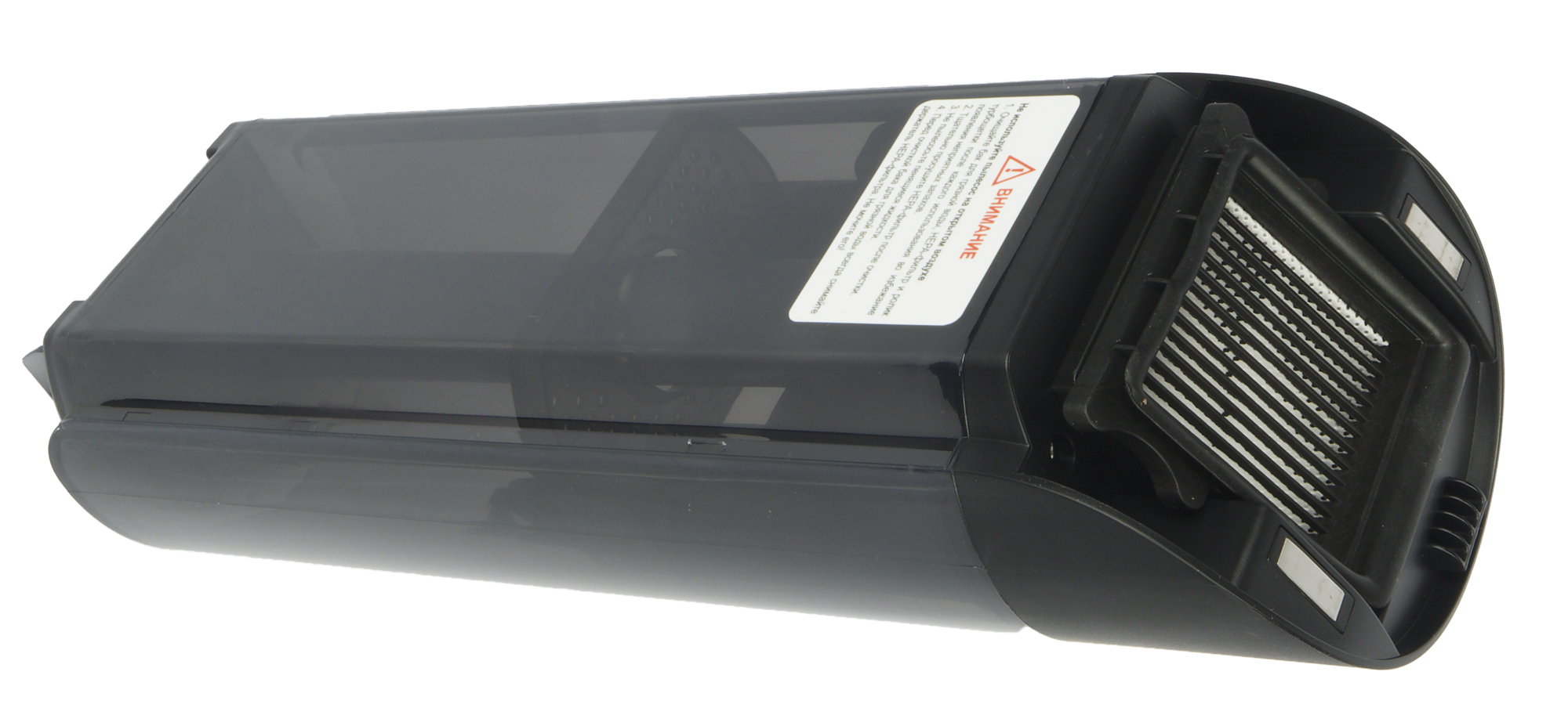Резервуар для грязной воды выполнен из темного полупрозрачного пластика. Воздушная струя с жидкостью и мусором попадает в него через центральную шахту. Вода и сор остаются на дне емкости, а воздух покидает ее через съемный водостойкий HEPA-фильтр.