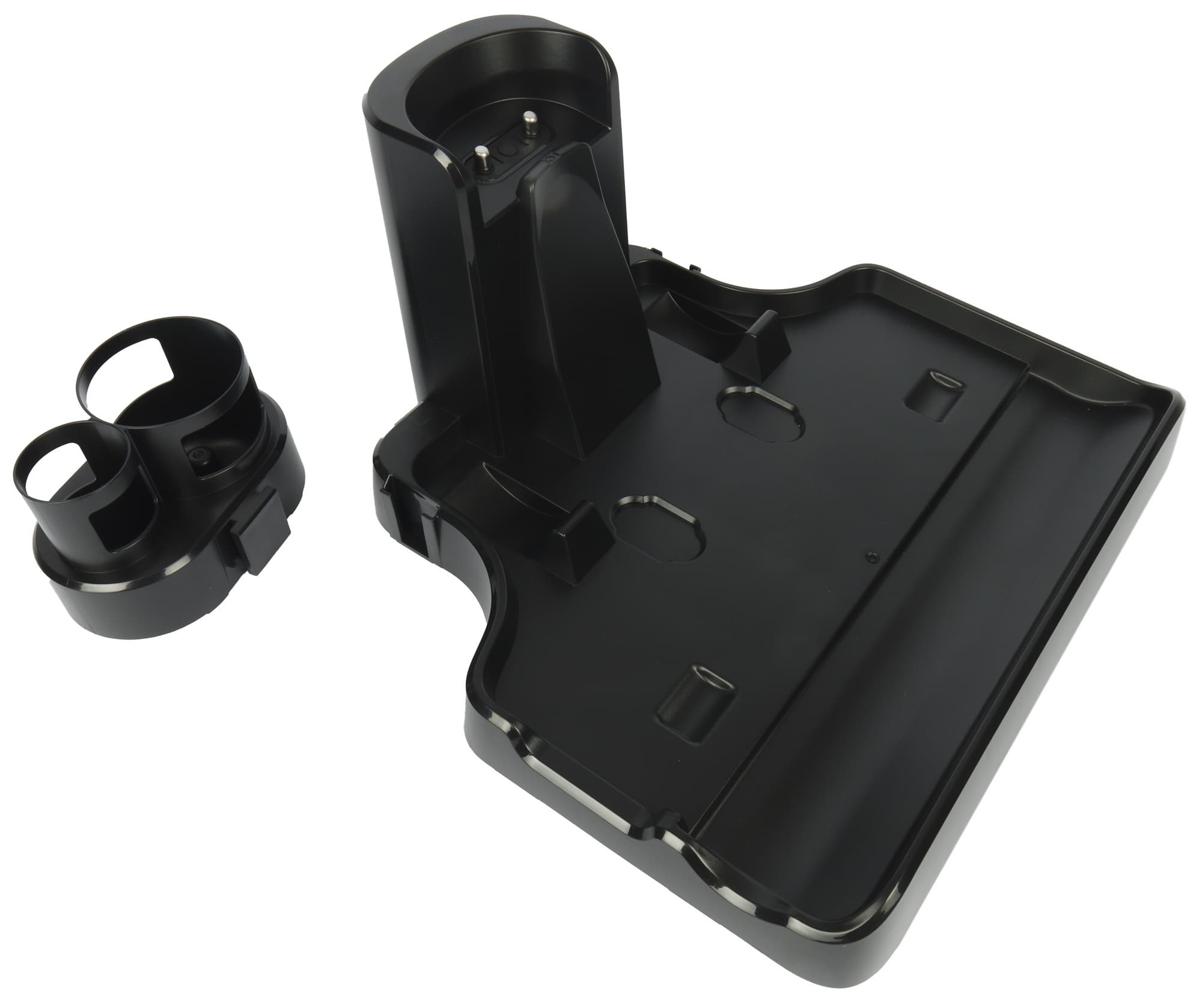 База пылесоса используется для самоочистки, зарядки и хранения пылесоса. В ее передней части есть углубление, где при промывке ротора собирается излишек воды, а в вертикальном держателе — электроконтакты, через которые пылесос подключается к источнику тока. На подставке справа или слева можно закрепить пластиковый держатель для аксессуаров — дополнительного ротора и чистящего ершика.