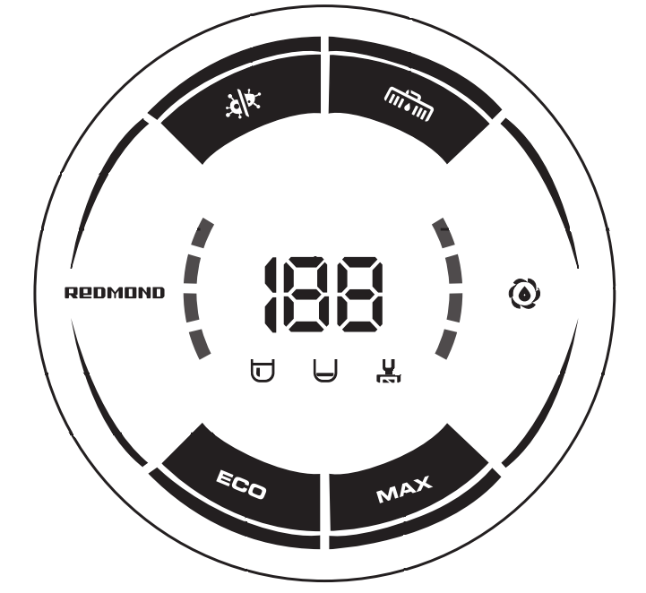 Под цифрами заряда располагаются индикаторы, сообщающие пользователю о возможных проблемах: переполнении резервуара для грязной жидкости, опустошении бака для чистой воды и блокировке роторной щетки.