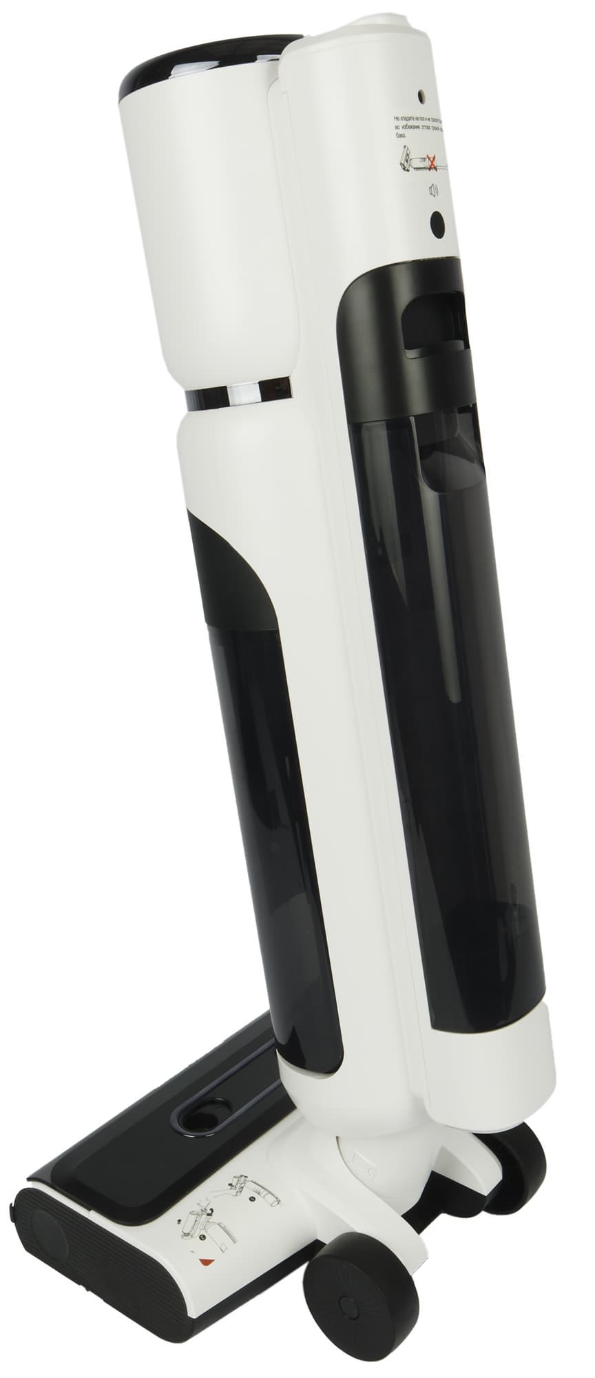 Корпус пылесоса оформлен в строгой черно-белой гамме. В его верхней части размещается моторный блок с несъемным аккумулятором и круглым цветным дисплеем.