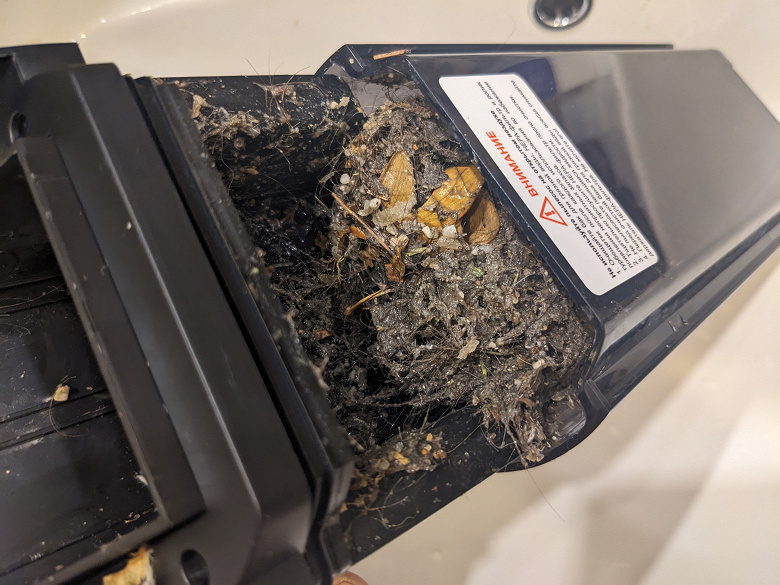 Уровень грязной жидкости через темные стенки резервуара виден только при очень ярком освещении, но большой необходимости контролировать заполнение нет: объем бака для чистой воды в точности соответствует максимальной емкости мусоросборника.