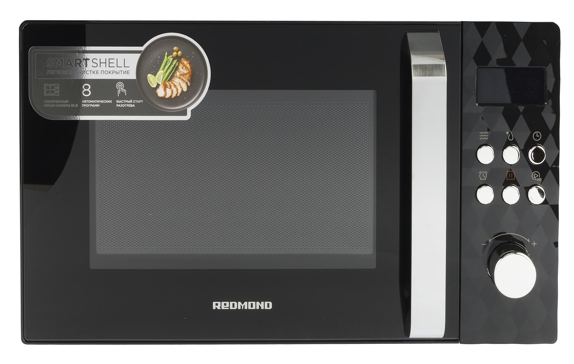 Микроволновая печь Redmond MW2902 в основном черного цвета и имеет серебристые акценты в виде ручки, кнопок, поворотного переключателя и логотипа компании на дверце.