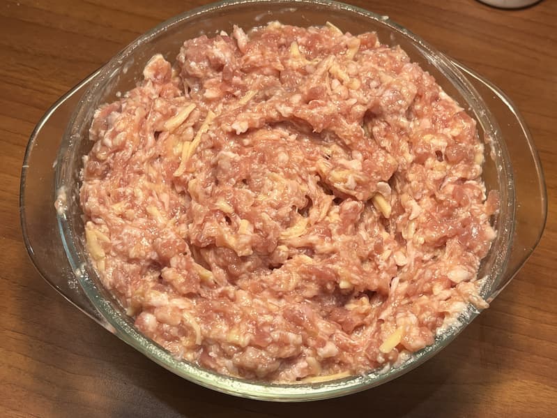 Для начала мы сложили фарш, сыр, яйца и специи в одну емкость и тщательно перемешали.