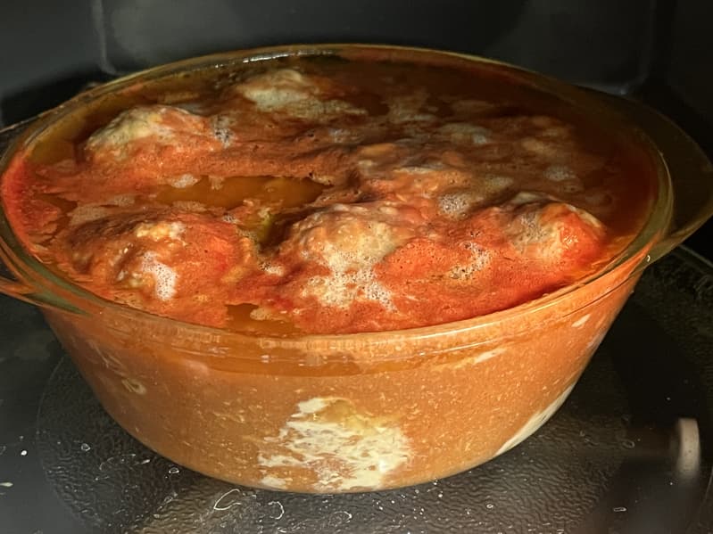 Уложили наши тефтели в горячий соус и отправили готовиться на режиме максимальной мощности «P100», указав время работы в 10 минут.