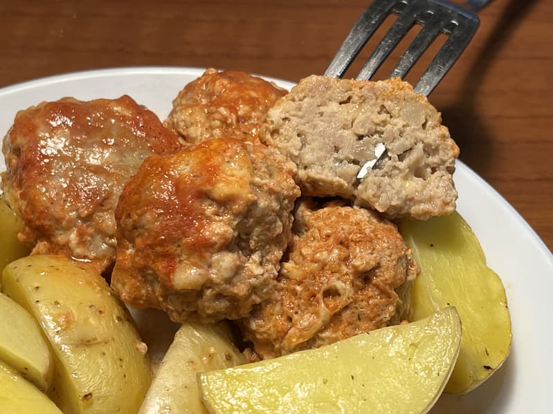 Сыр в тефтелях расплавился, соус загустел, а сами тефтели получились сочными и очень вкусными.