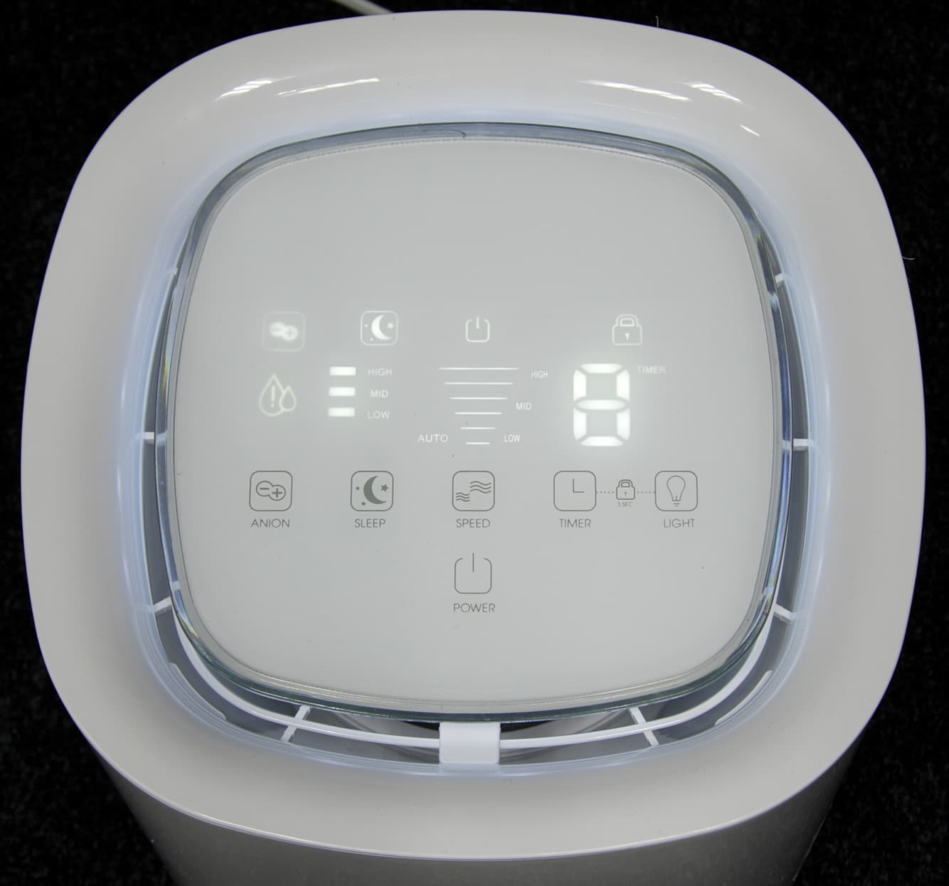Кнопками пользователь может включать мойку или переводить ее в режим ожидания, выбирать один из трех уровней мощности вентилятора, включать автоматический режим, в котором мощность зависит от текущего уровня влажности, активировать ночной режим с минимальным свечением индикаторов и мощностью вентилятора, управлять работой ионизатора, включать контурную подсветку-ночник, устанавливать таймер на отключения до 8 часов с шагом в 1 час и блокировать контрольную панель. Светящиеся значки на панели указывают на текущий режим и выбранные опции, а трехсегментный индикатор — на текущий уровень влажности в помещении в абстрактных величинах низкий/средний/высокий.