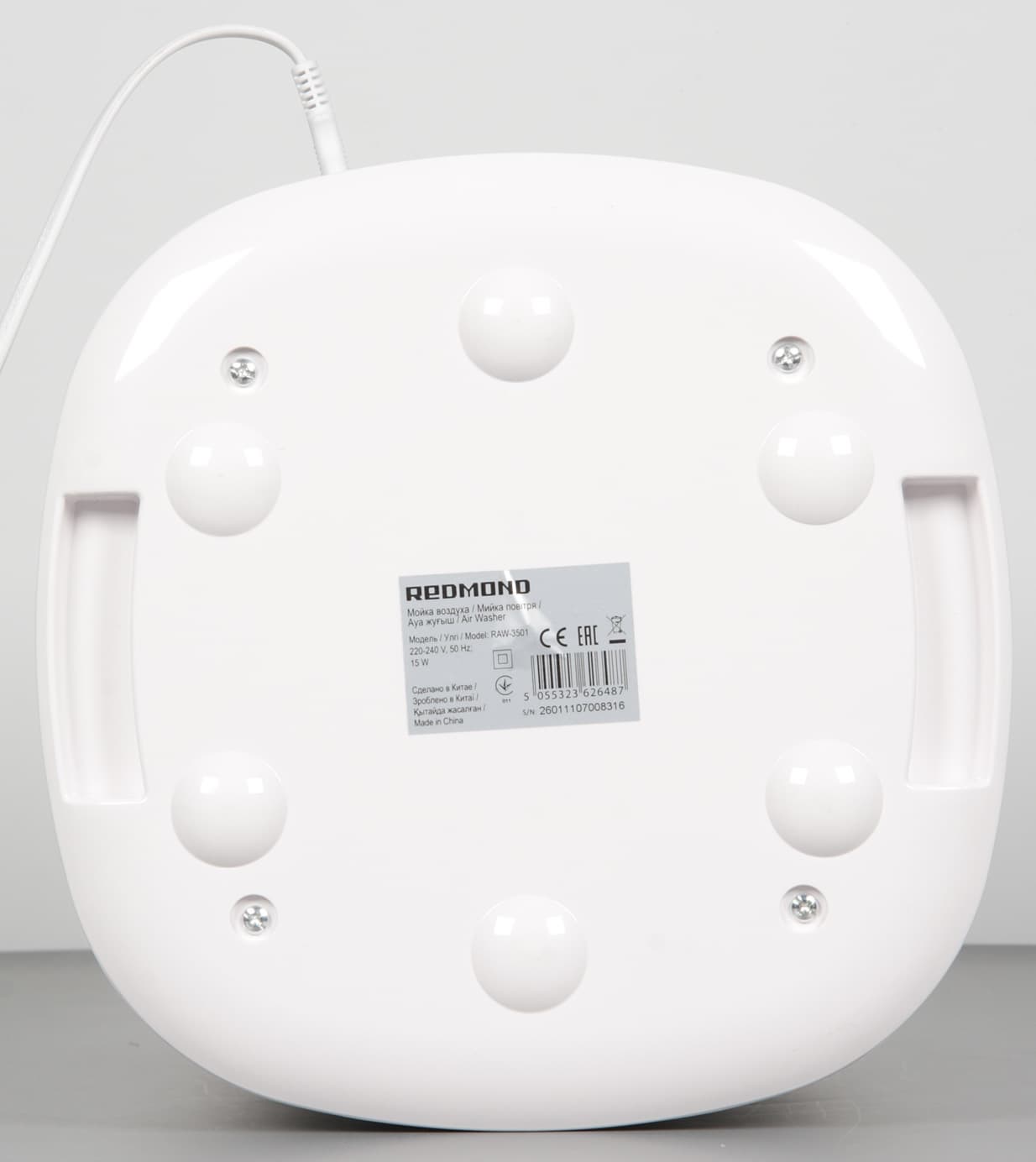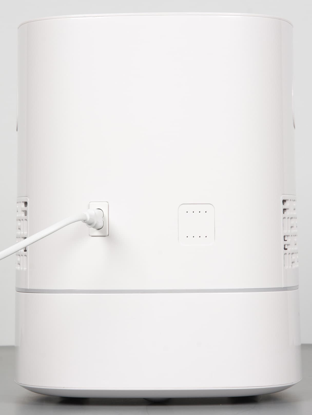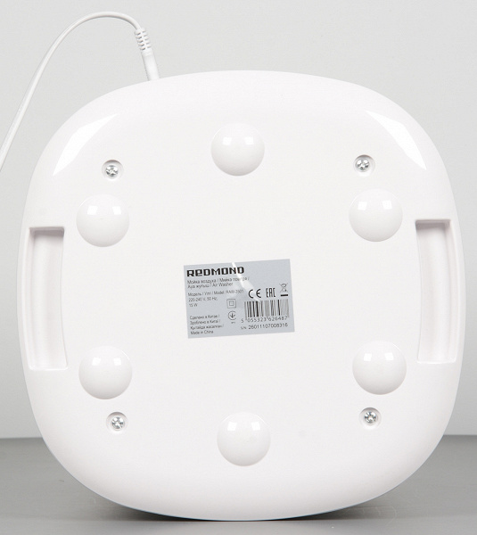Корпус мойки изготовлен из белого пластика снаружи зеркально-гладкого и, возможно, с покрытием. Следы от пальцев на таком пластике незаметны и очищается он легко, по крайней мере, пока не поцарапан. Согласно нашим измерениям, высота устройства 320 мм, ширина и глубина в нижней части достигают 251 мм, а к верху они уменьшаются до 241 мм. Без воды мойка весит 3575 г. Длина кабеля питания 170 см. Спереди внизу размещен логотип бренда.