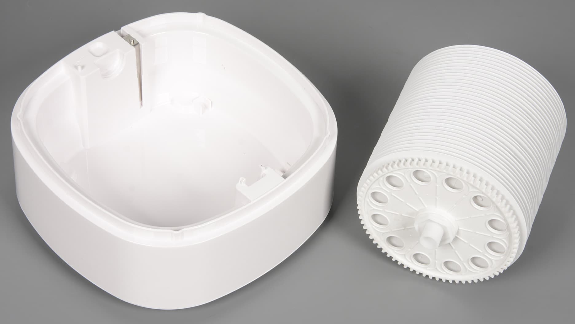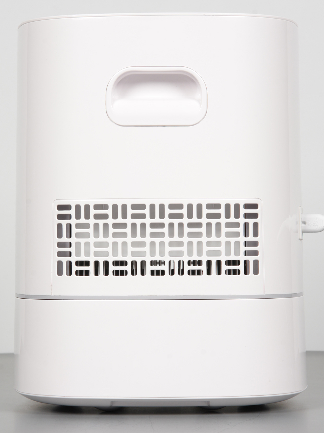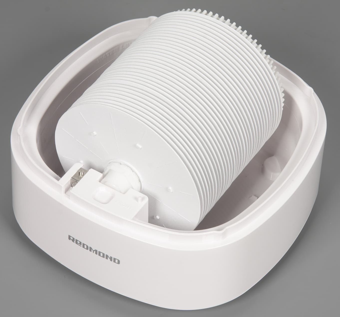 Корпус мойки изготовлен из белого пластика снаружи зеркально-гладкого и, возможно, с покрытием. Следы от пальцев на таком пластике незаметны и очищается он легко, по крайней мере, пока не поцарапан. Согласно нашим измерениям, высота устройства 320 мм, ширина и глубина в нижней части достигают 251 мм, а к верху они уменьшаются до 241 мм. Без воды мойка весит 3575 г. Длина кабеля питания 170 см. Спереди внизу размещен логотип бренда.