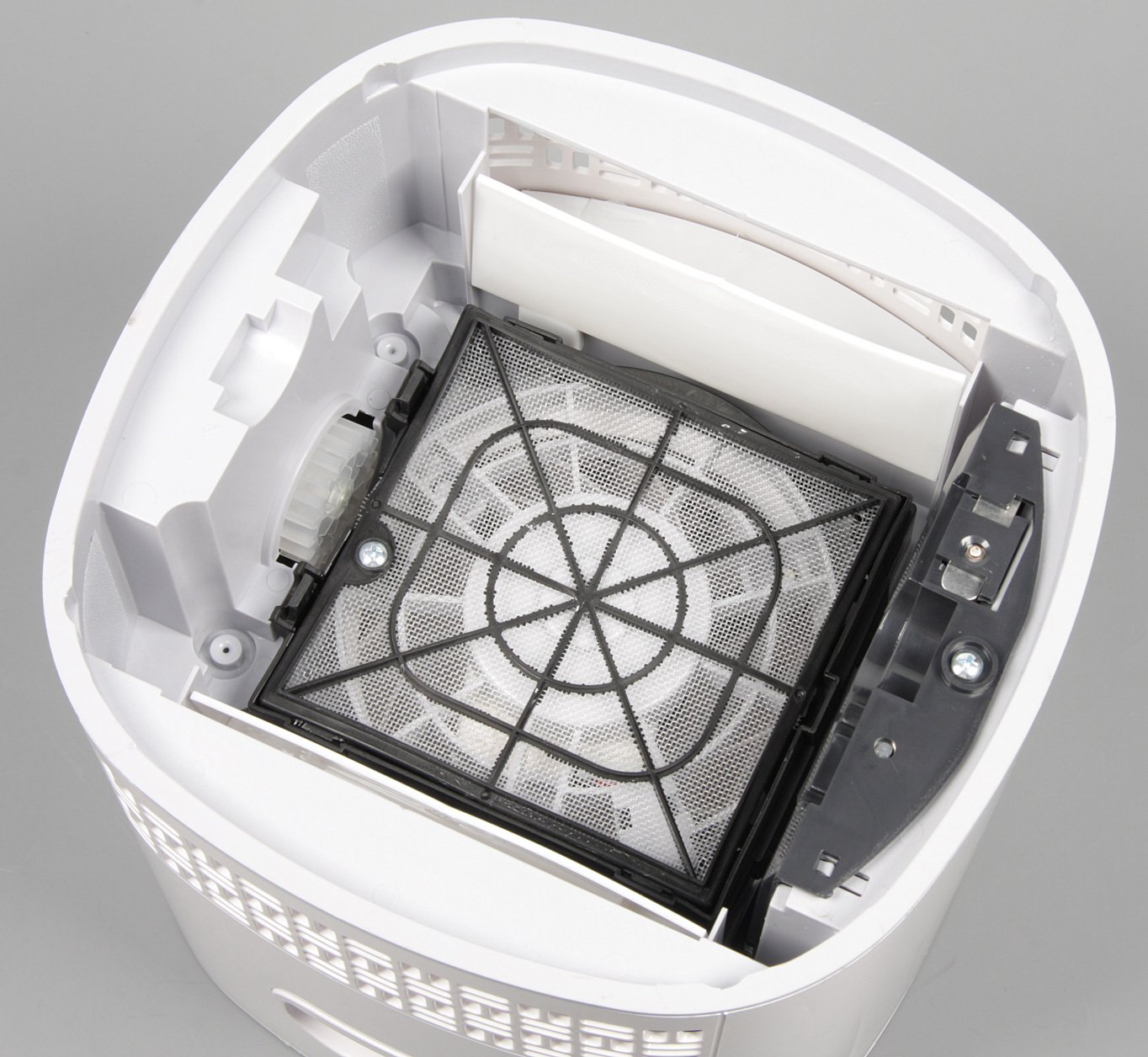 Корпус мойки состоит из двух частей, которые между собой никак не скреплены: верхняя просто стоит на нижней. В верхней части находятся вся электроника управления, мотор, вентилятор, привод дисков, ионизатор. При взгляде снизу на верхнюю часть можно рассмотреть защитную решетку, крыльчатку вентилятора и шестерню привода дисков.