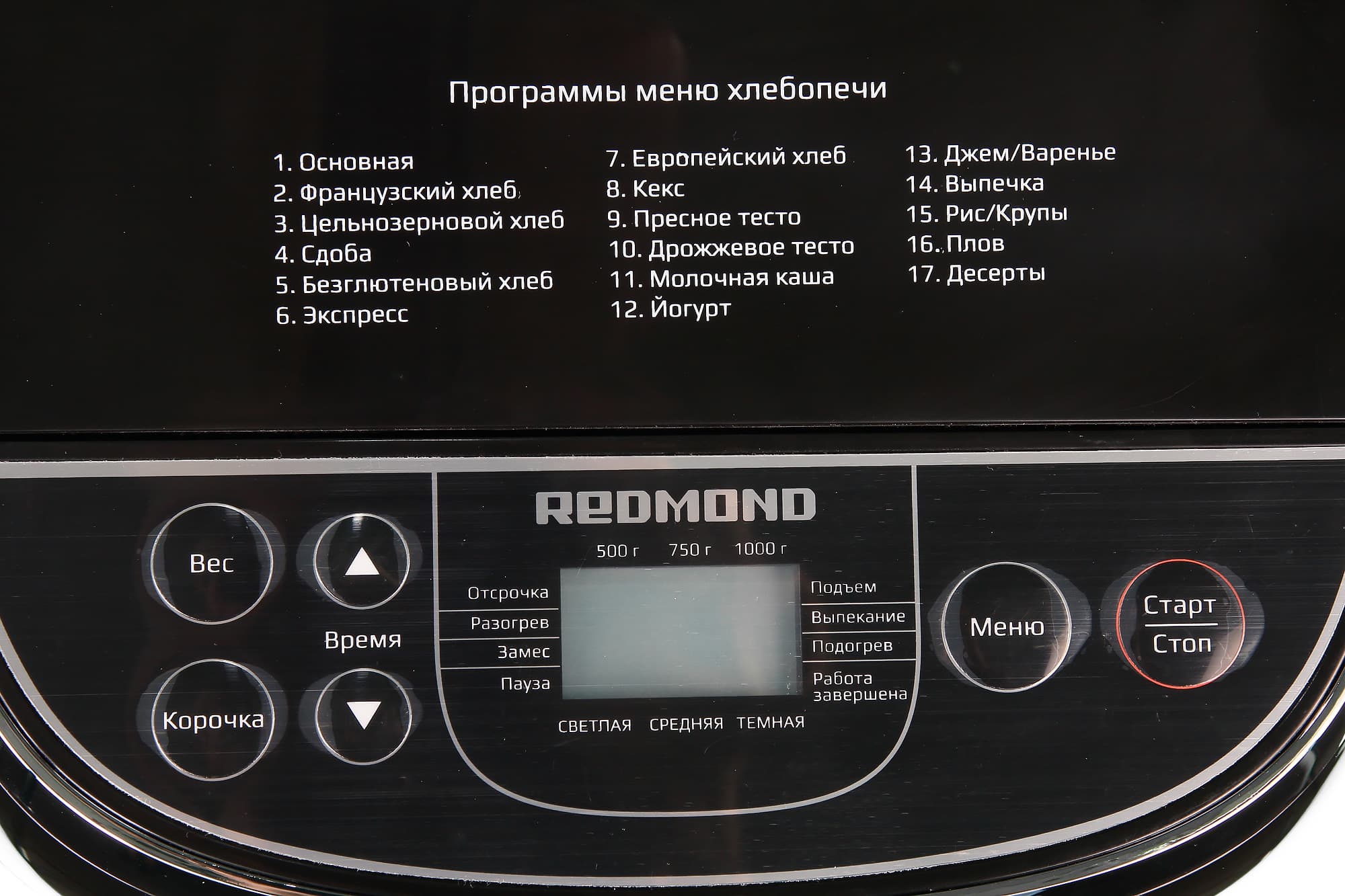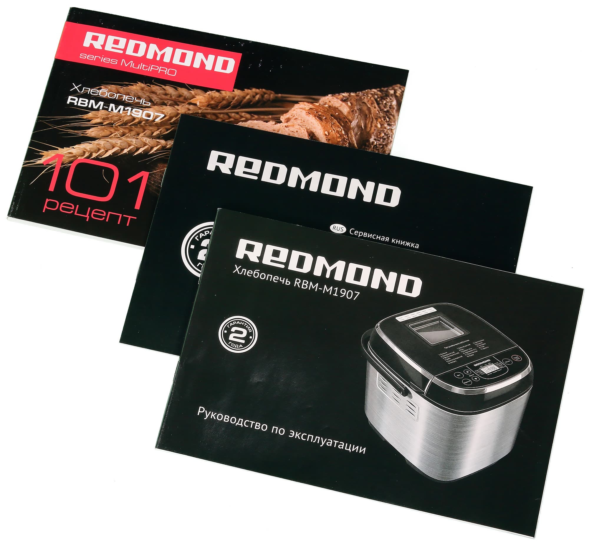 Инструкция, прилагаемая к хлебопечке, как и упаковка, оказалась выполнена по единому стандарту, принятому в Redmond. Это 68-страничная брошюра небольшого формата, отпечатанная на качественной глянцевой бумаге. На долю русского языка приходится 17 страниц, на которых можно найти всю необходимую информацию о работе с прибором — начиная с правил использования и описания возможностей программ, и заканчивая советами по приготовлению.