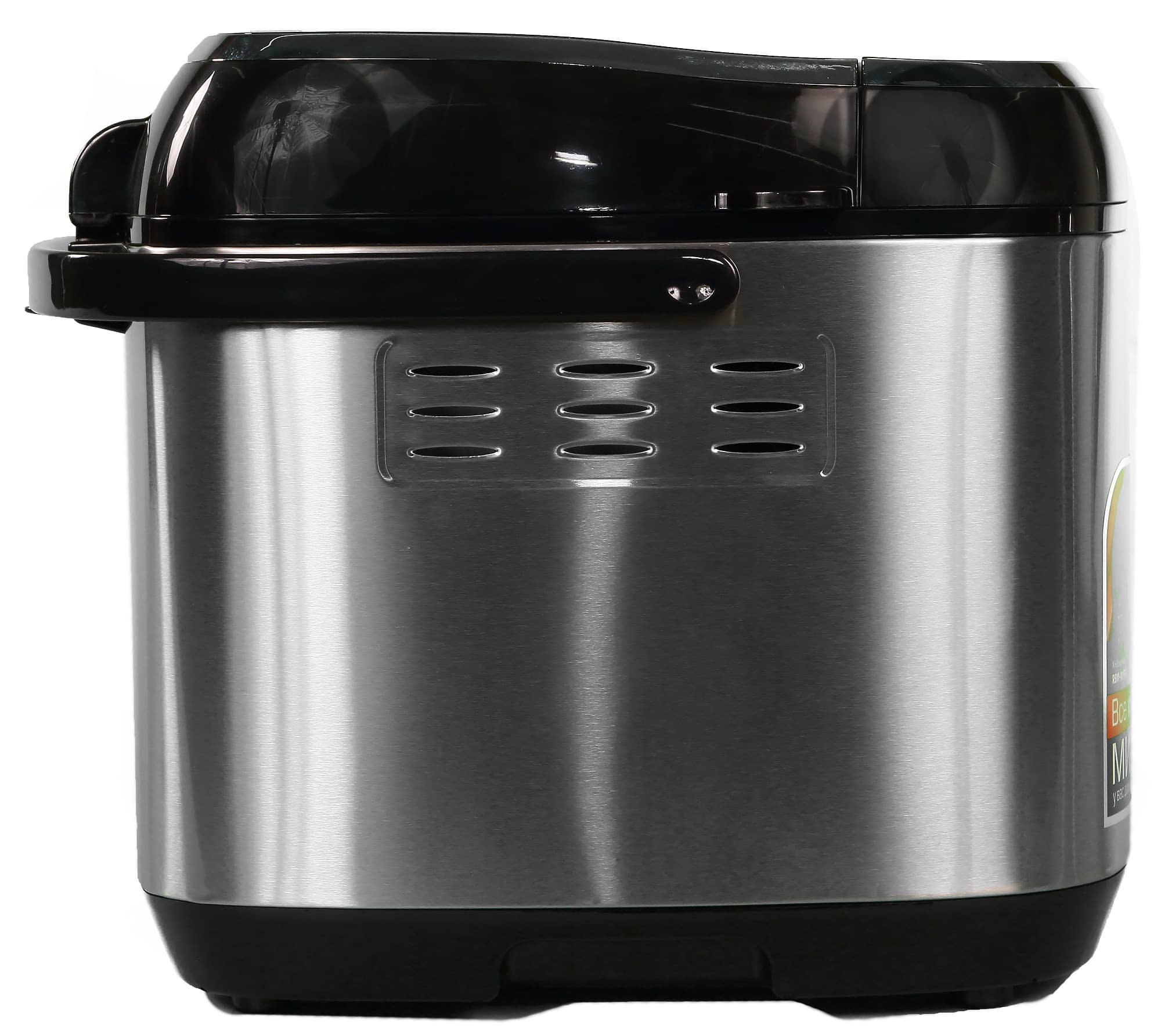 Дополнительные прорези для вентиляции присутствуют и на самом корпусе прибора, по бокам и сзади. Есть у хлебопечки и обычная откидная ручка, благодаря которой можно без труда перенести прибор на новое место прямо вместе с содержимым (таким образом можно, например, сначала заложить в хлебопечь все ингредиенты, а уже потом отнести ее в дальний угол, где она не будет мешать).
