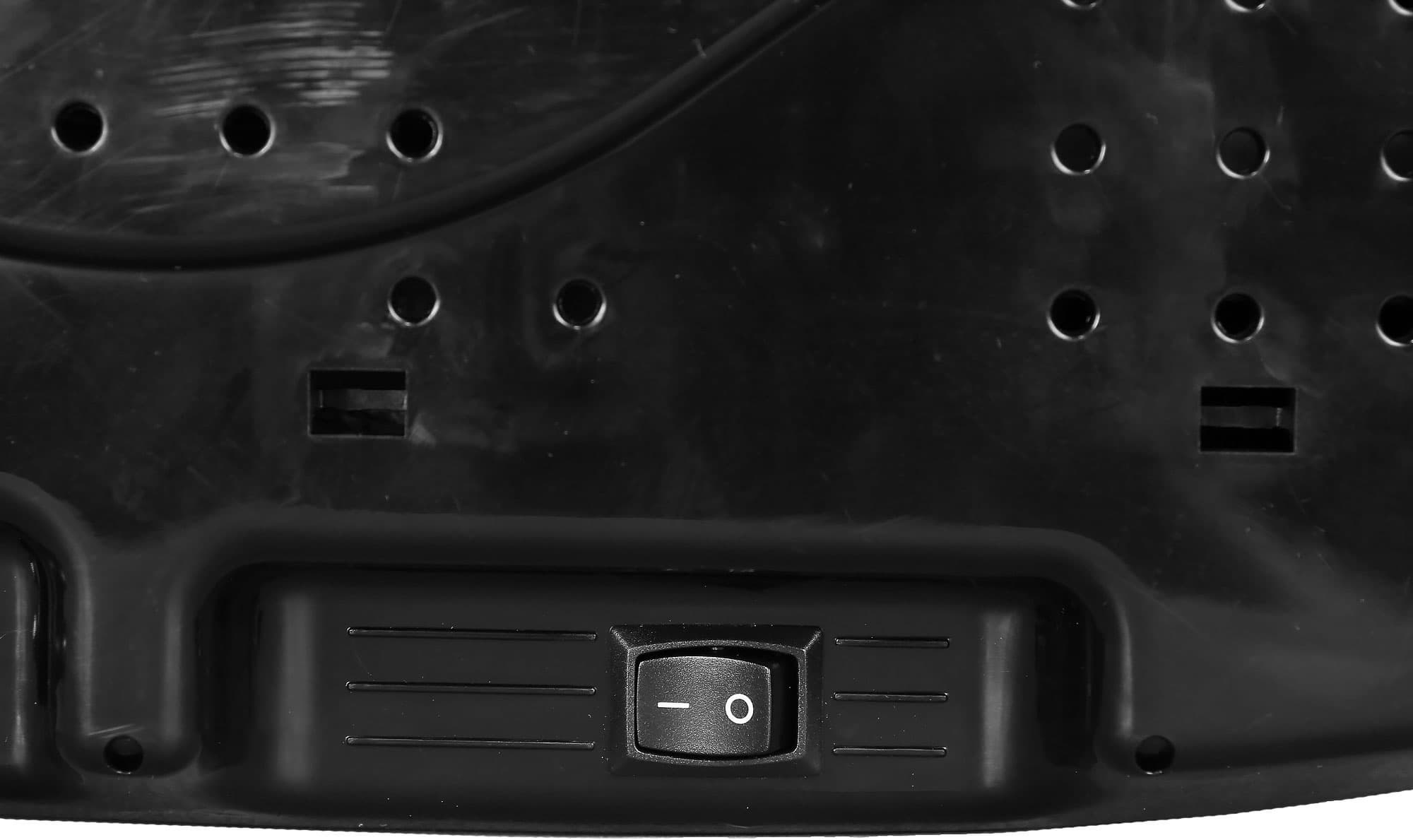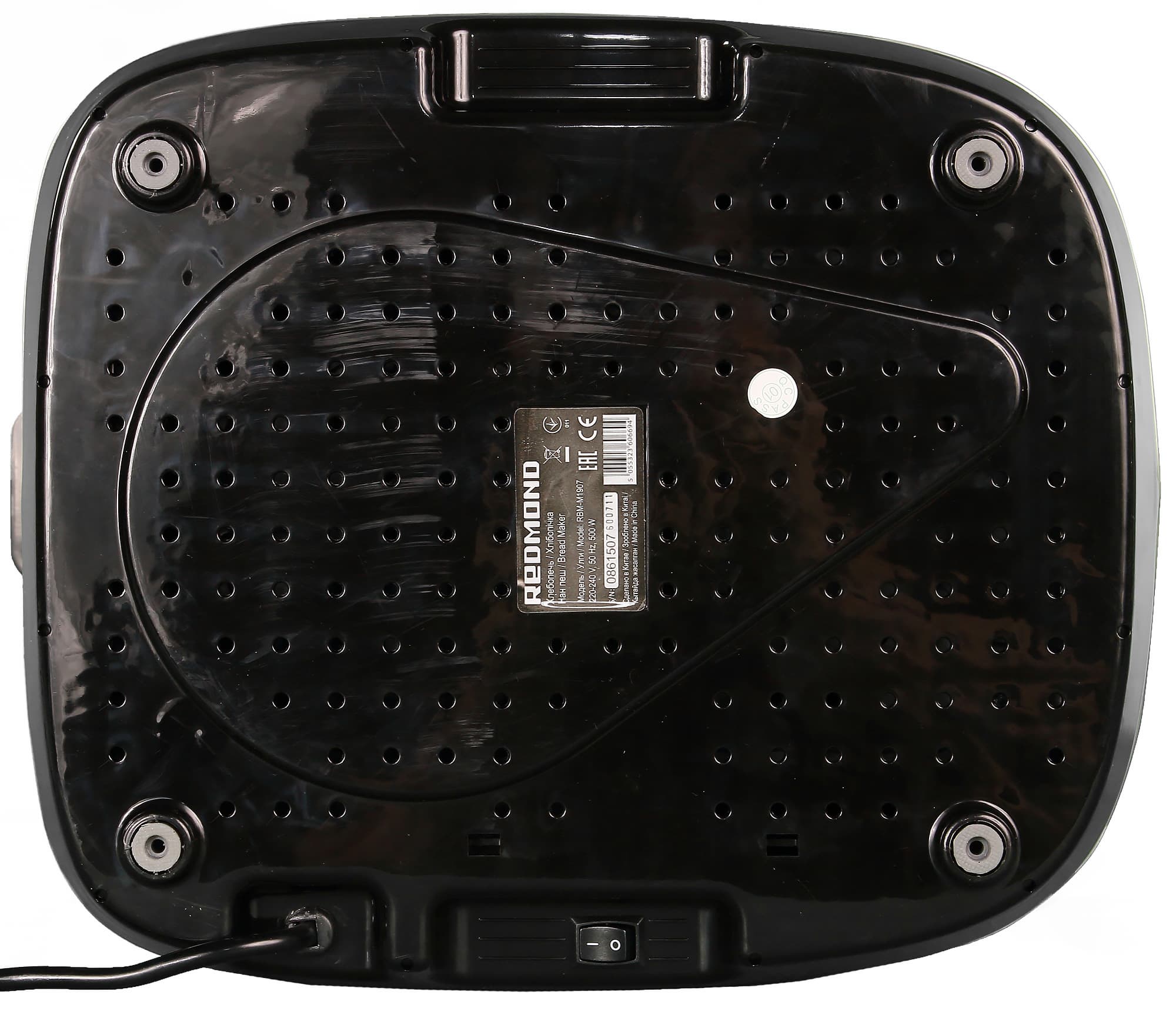 Снизу у хлебопечки можно увидеть пластиковое дно с вентиляционными отверстиями и резиновые ножки, обеспечивающие сцепление с рабочей поверхностью и уменьшающие потенциальные вибрации, возникающие в процессе работы мотора. Также в нижней части располагаются: углубления, выполняющие роль ручек для переноски прибора, шнур электропитания и кнопка включения прибора, расположенная в правой «ручке»-углублении.
